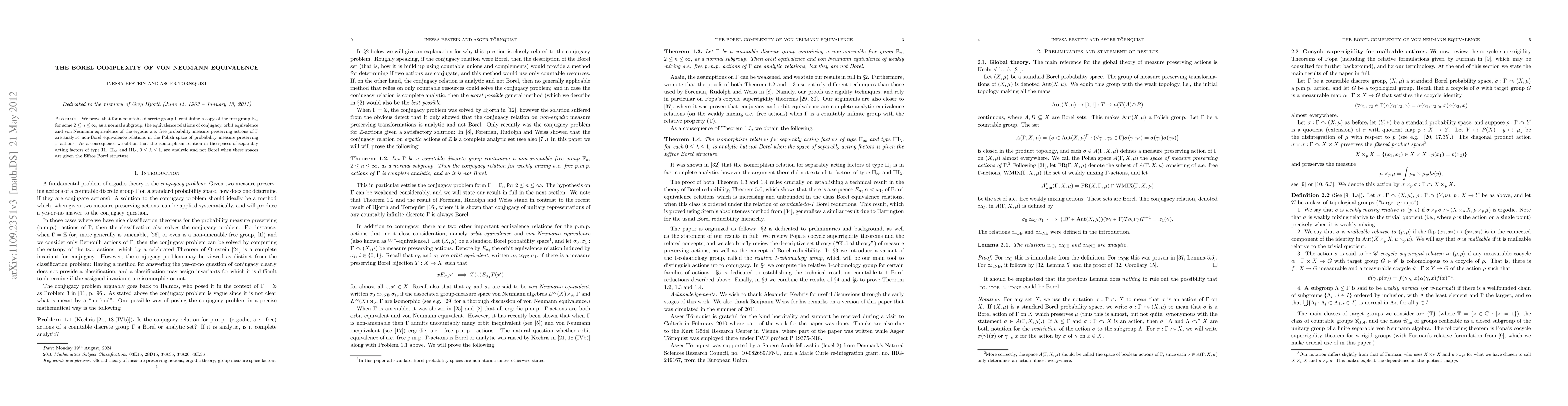 This paper demonstrates that for countable discrete groups containing a free group, the equivalence relations of conjugacy, orbit equivalence, and von Neumann equivalence of their ergodic free actions are analytic but not Borel in the space of probability measure preserving actions. It also shows that the isomorphism relations in spaces of type $\II_1$, $\II_\infty$, and $\III_\lambda$ factors are analytic but not Borel under the Effros Borel structure.