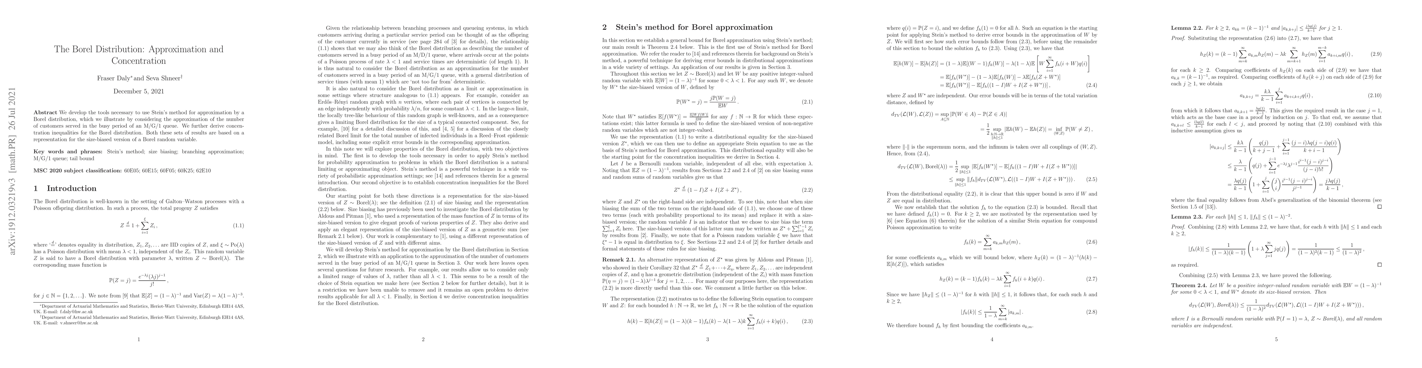 We develop the tools necessary to use Stein's method for approximation by a Borel distribution, which we illustrate by considering the approximation of the number of customers served in the busy period of an M/G/1 queue. We further derive concentration inequalities for the Borel distribution. Both these sets of results are based on a representation for the size-biased version of a Borel random variable.