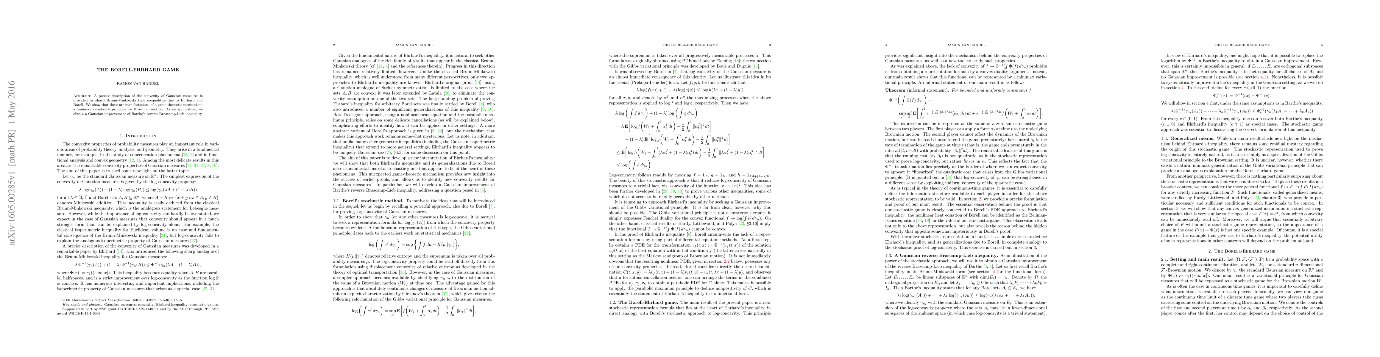 A precise description of the convexity of Gaussian measures is provided by sharp Brunn-Minkowski type inequalities due to Ehrhard and Borell. We show that these are manifestations of a game-theoretic mechanism: a minimax variational principle for Brownian motion. As an application, we obtain a Gaussian improvement of Barthe's reverse Brascamp-Lieb inequality.