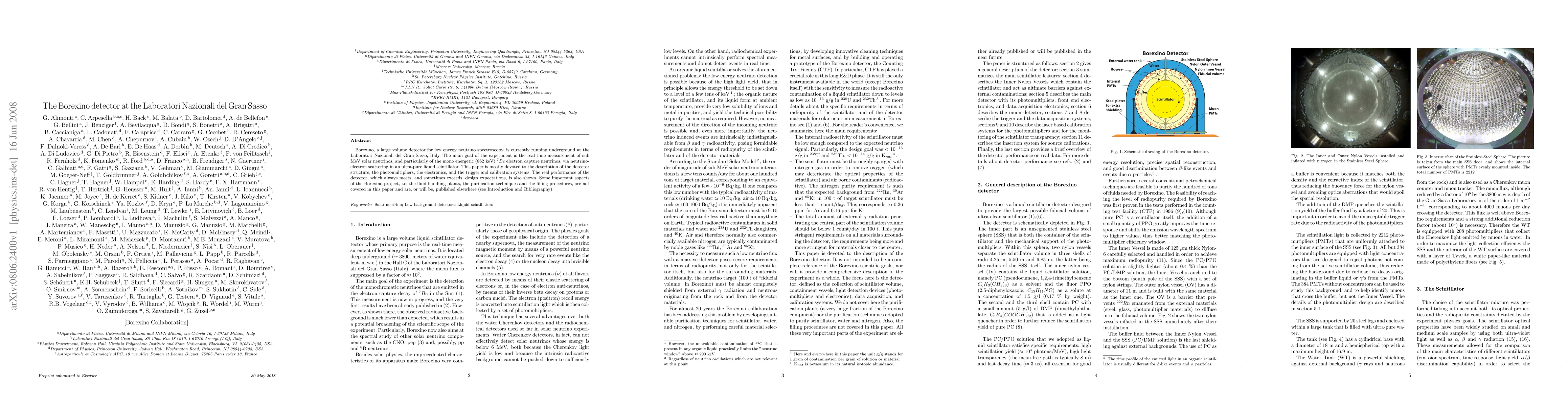 Borexino, a low-energy neutrino detector at the Laboratori Nazionali del Gran Sasso, aims to measure sub MeV solar neutrinos, particularly Be7 electron capture neutrinos. The paper details the detector's structure, photomultipliers, electronics, and calibration systems, showcasing its performance that often exceeds design expectations.