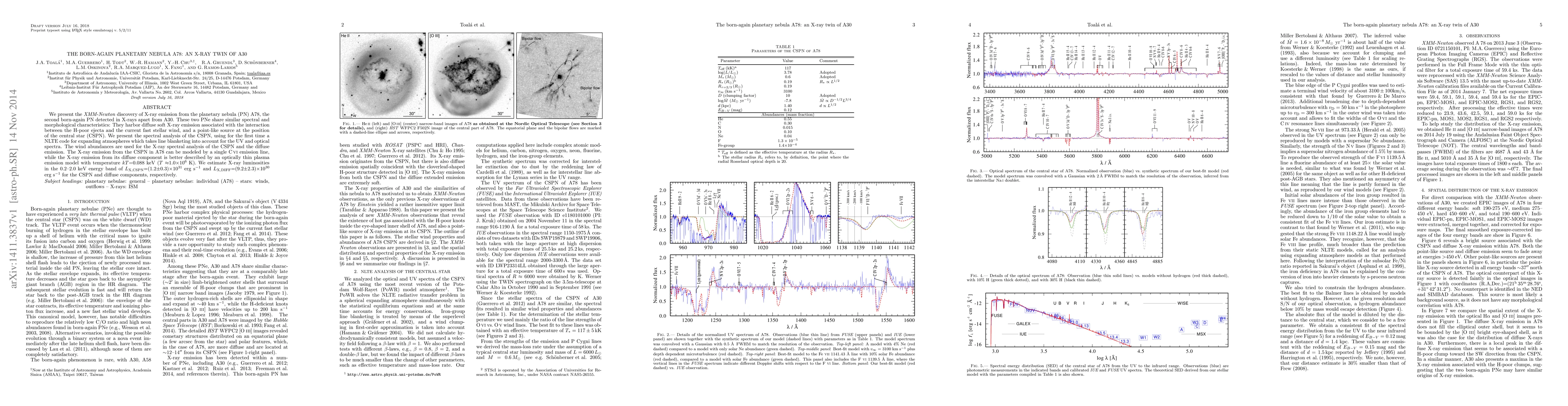 The research identifies X-ray emission from the planetary nebula A78, similar to A30, both being born-again PNe. X-ray emission originates from a central star and diffuse components, analyzed using NLTE codes, revealing C VI emission from the star and a 0.088 keV optically thin plasma for the diffuse emission. X-ray luminosities are estimated at (1.2±0.3)×10^31 erg s^-1 for the CSPN and (9.2±2.3)×10^30 erg s^-1 for the diffuse component.