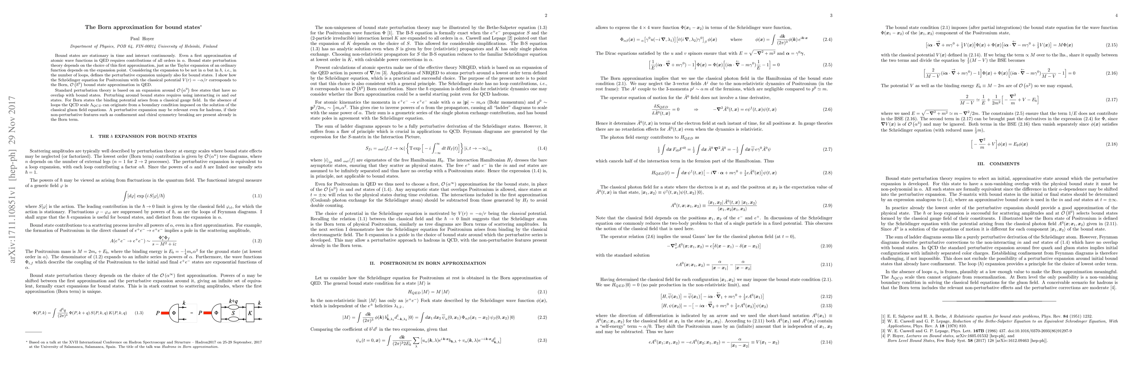Bound states are stationary in time and interact continuously. Even a first approximation of atomic wave functions in QED requires contributions of all orders in \alpha. Bound state perturbation theory depends on the choice of this first approximation, just as the Taylor expansion of an ordinary function depends on the expansion point. Considering the expansion to be not in $\alpha$ but in $\hbar$, i.e., in the number of loops, defines the perturbative expansion uniquely also for bound states. I show how the Schr\"odinger equation for Positronium with the classical potential $V(r)=-\alpha/r$ corresponds to the Born, $O(\hbar^0)$ bound state approximation in QED. Standard perturbation theory is based on an expansion around $O(\alpha^0)$ free states that have no overlap with bound states. Perturbing around bound states requires using interacting $in$ and $out$ states. For Born states the binding potential arises from a classical gauge field. In the absence of loops the QCD scale $\Lambda_{QCD}$ can originate from a boundary condition imposed on the solution of the classical gluon field equations. A perturbative expansion may be relevant even for hadrons, if their non-perturbative features such as confinement and chiral symmetry breaking are present already in the Born term.
