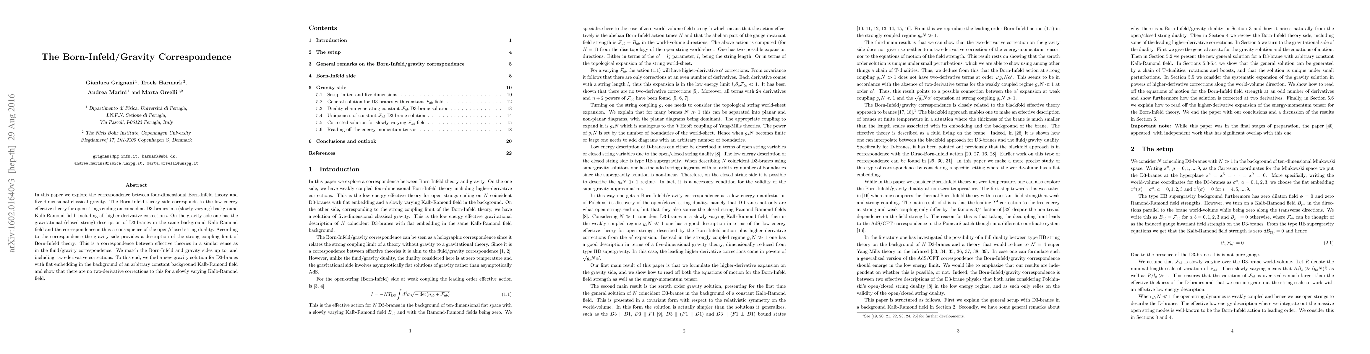 This paper establishes a correspondence between four-dimensional Born-Infeld theory and five-dimensional classical gravity, demonstrating that the gravity side describes the strong coupling limit of the Born-Infeld theory, akin to the fluid/gravity correspondence. The authors find a new gravity solution for D3-branes and show no two-derivative corrections for a slowly varying Kalb-Ramond field.