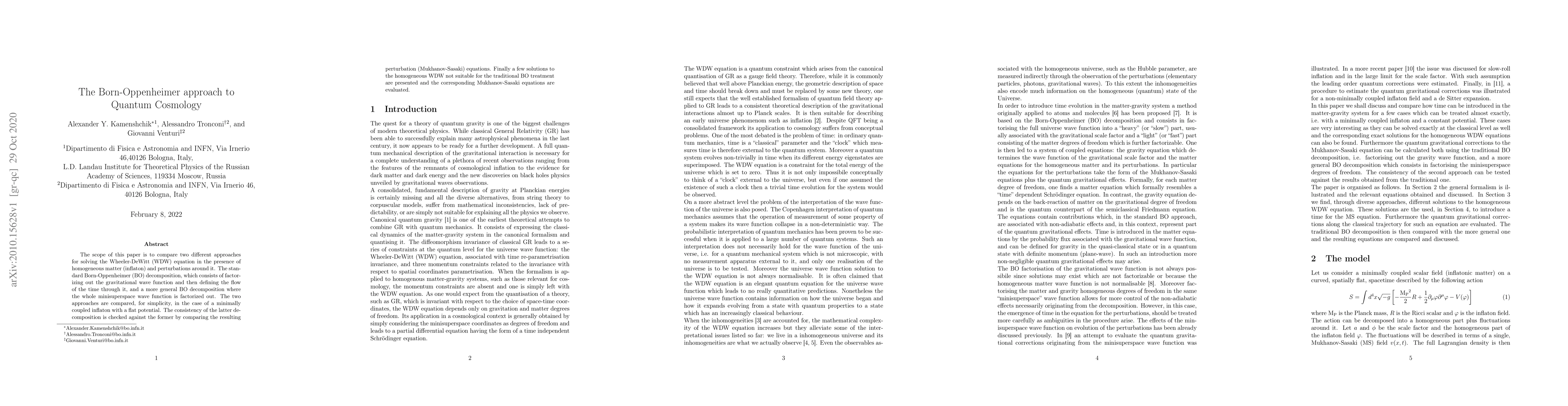 The scope of this paper is to compare two different approaches for solving the Wheeler-DeWitt (WDW) equation in the presence of homogeneous matter (inflaton) and perturbations around it. The standard Born-Oppenheimer (BO) decomposition, which consists of factorizing out the gravitational wave function and then defining the flow of the time through it, and a more general BO decomposition where the whole minisuperspace wave function is factorized out. The two approaches are compared, for simplicity, in the case of a minimally coupled inflaton with a flat potential. The consistency of the latter decomposition is checked against the former by comparing the resulting perturbation (Mukhanov-Sasaki) equations. Finally a few solutions to the homogeneous WDW not suitable for the traditional BO treatment are presented and the corresponding Mukhanov-Sasaki equations are evaluated.