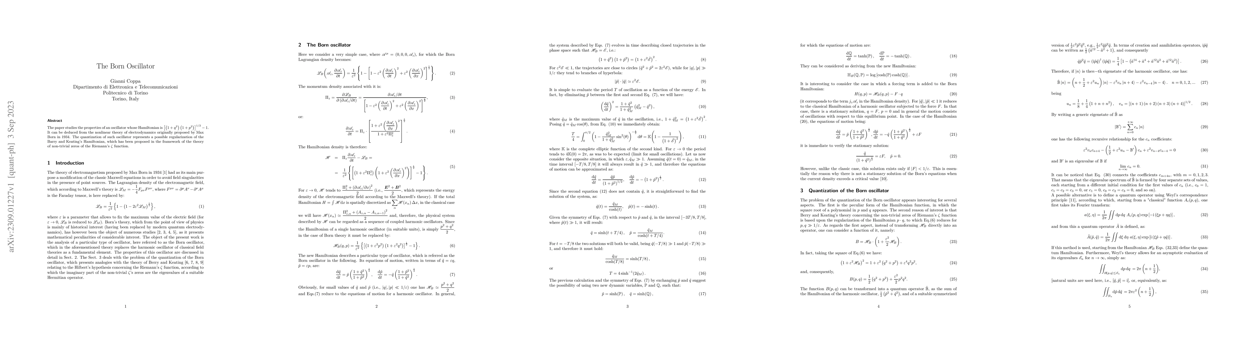 The Born Oscillator explores a nonlinear Hamiltonian derived from Max Born's electrodynamics, proposing its quantization as a regularization method for Barry and Keating's Hamiltonian linked to the Riemann zeta function's non-trivial zeros.