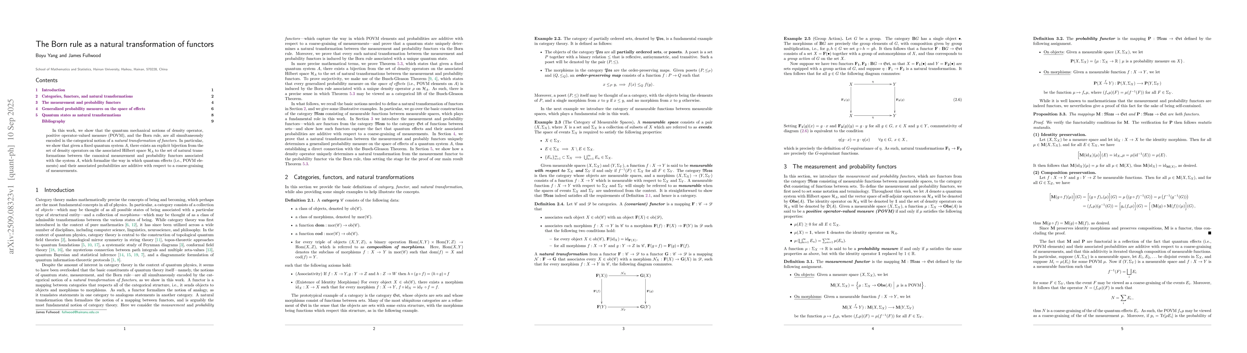 In this work, we show that the quantum mechanical notions of density operator, positive operator-valued measure (POVM), and the Born rule, are all simultaneously encoded in the categorical notion of a natural transformation of functors. In particular, we show that given a fixed quantum system, there exists an explicit bijection from the set of density operators on the associated Hilbert space to the set of natural transformations between the canonical measurement and probability functors associated with the system, which formalize the way in which quantum effects (i.e., POVM elements) and their associated probabilities are additive with respect to a coarse-graining of measurements.