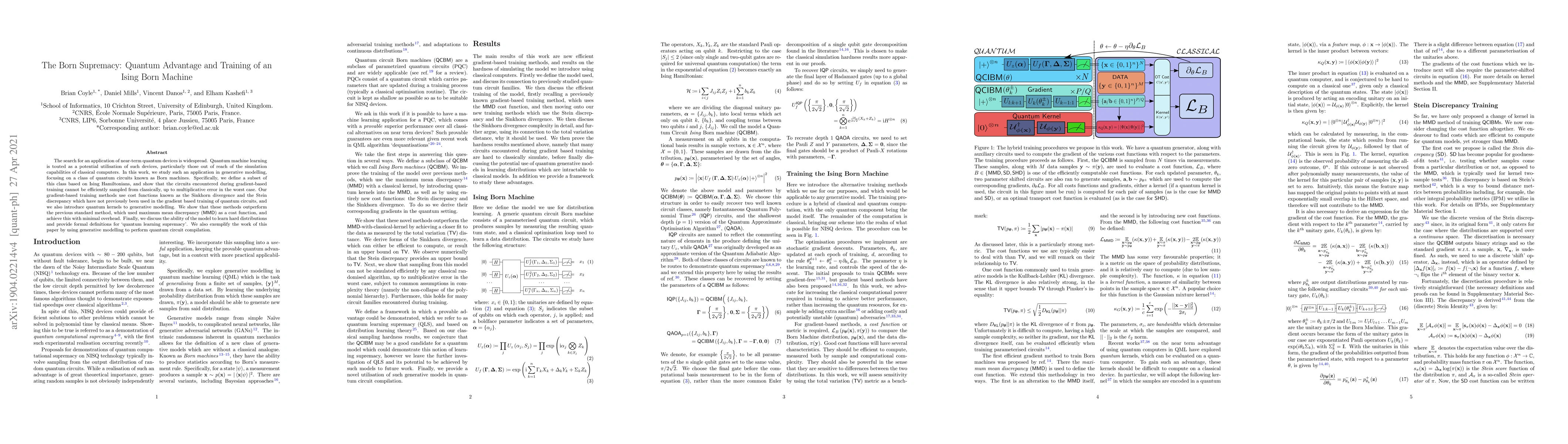 This paper proposes a generative Quantum Machine Learning Model called the Ising Born Machine (IBM) that demonstrates quantum advantage over classical simulation. It introduces two novel training methods using Stein Discrepancy and Sinkhorn Divergence, showing superior performance over Maximum Mean Discrepancy on both simulators and a real quantum device.