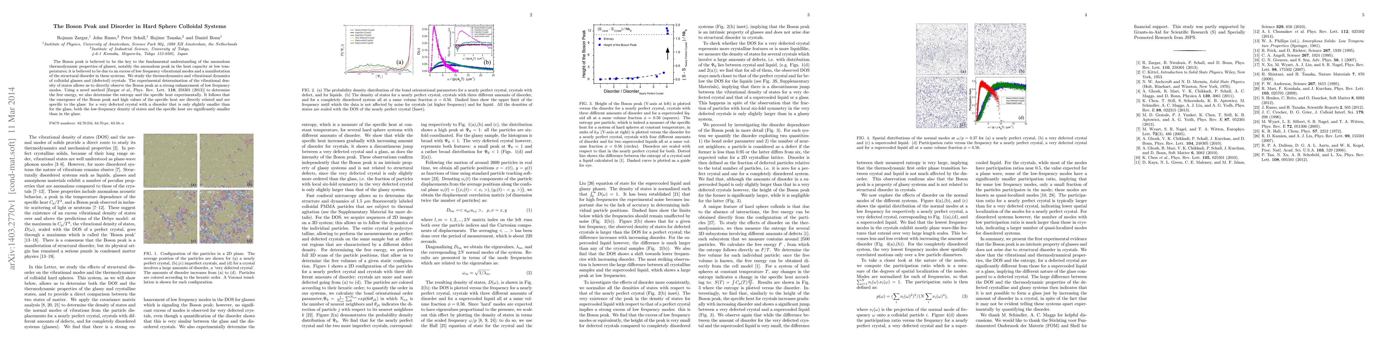 This paper explores the Boson peak in colloidal glasses and crystals, linking it to structural disorder and anomalous thermodynamic properties. Experimental methods reveal the Boson peak's strong enhancement of low-frequency vibrations, and the study finds a direct correlation between the peak and high specific heat values, which are specific to glasses.