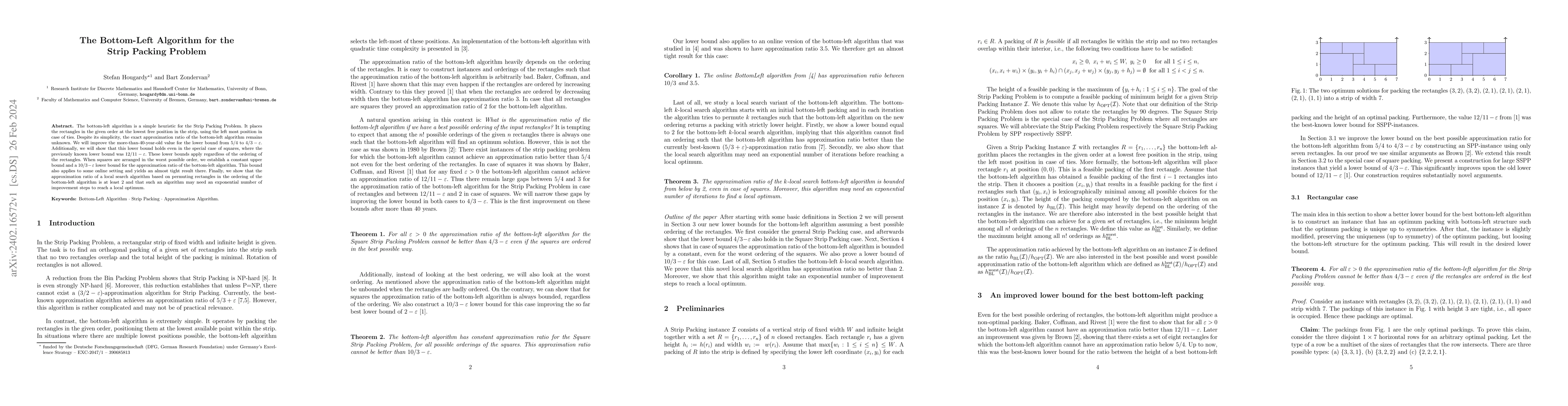 The bottom-left algorithm is a simple heuristic for the Strip Packing Problem. It places the rectangles in the given order at the lowest free position in the strip, using the left most position in case of ties. Despite its simplicity, the exact approximation ratio of the bottom-left algorithm remains unknown. We will improve the more-than-40-year-old value for the lower bound from $5/4$ to $4/3 - \varepsilon$. Additionally, we will show that this lower bound holds even in the special case of squares, where the previously known lower bound was $12/11 -\varepsilon$. These lower bounds apply regardless of the ordering of the rectangles. When squares are arranged in the worst possible order, we establish a constant upper bound and a $10/3-\varepsilon$ lower bound for the approximation ratio of the bottom-left algorithm. This bound also applies to some online setting and yields an almost tight result there. Finally, we show that the approximation ratio of a local search algorithm based on permuting rectangles in the ordering of the bottom-left algorithm is at least~$2$ and that such an algorithm may need an exponential number of improvement steps to reach a local optimum.