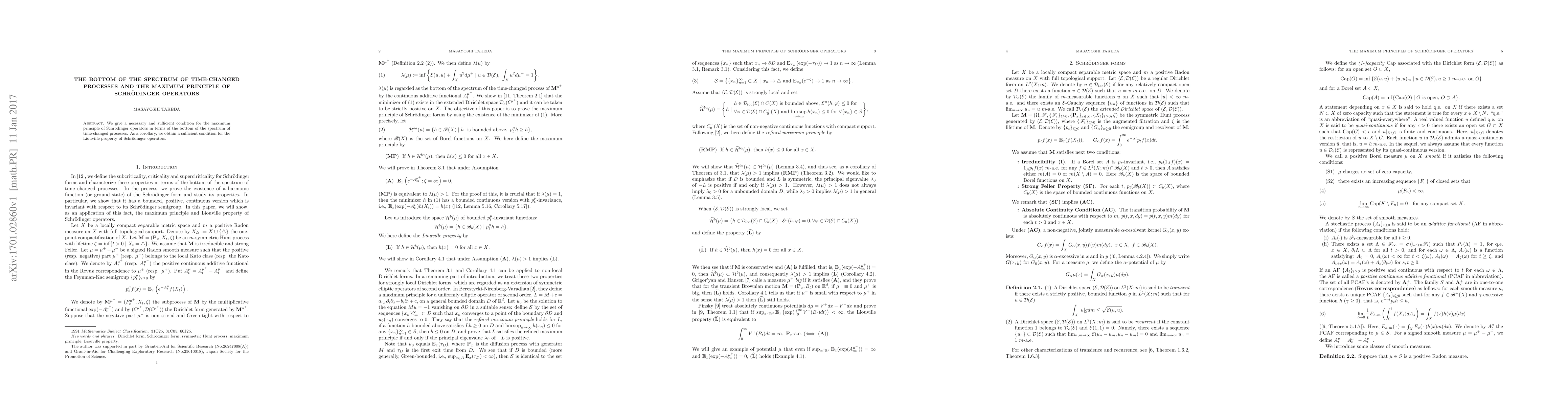 The paper establishes a necessary and sufficient condition for the maximum principle of Schrödinger operators using the bottom of the spectrum of time-changed processes, and derives a sufficient condition for the Liouville property.