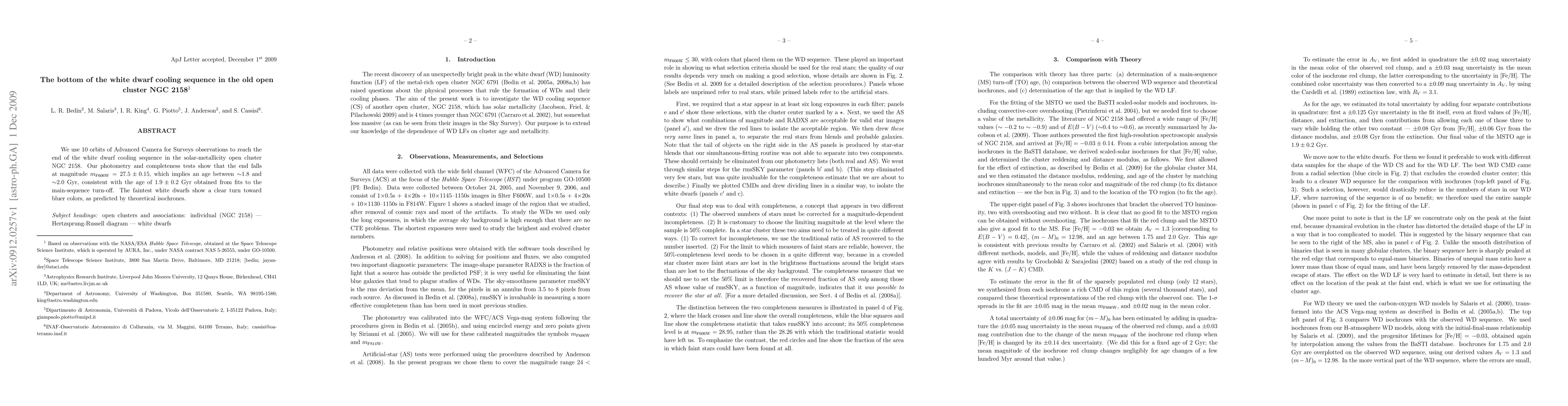 This study uses Advanced Camera for Surveys observations to determine the end of the white dwarf cooling sequence in NGC 2158, finding it at m_F606W = 27.5 +/- 0.15, indicating an age range of ~1.8 to ~2.0 Gyr, consistent with previous main-sequence turn-off age estimates. The faintest white dwarfs exhibit a predicted color shift towards bluer hues.