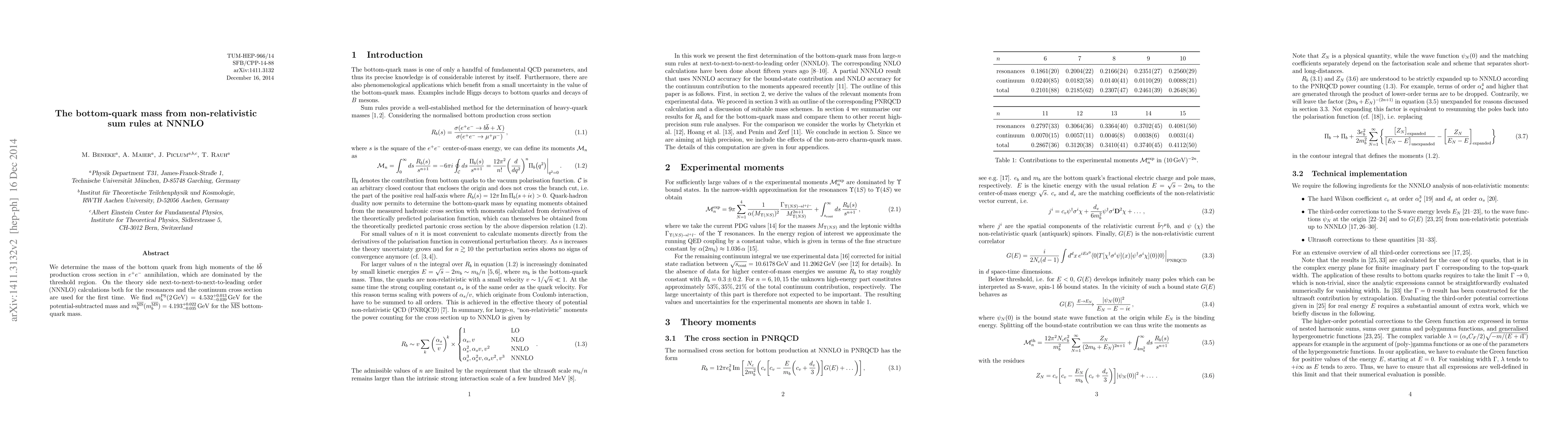 This paper determines the bottom quark mass using non-relativistic sum rules at NNNLO accuracy, finding mb,PS(2 GeV) = 4.532 ± 0.056 GeV and mb,MSbar(mb,MSbar) = 4.193 ± 0.057 GeV for potential-subtracted and MSbar masses, respectively. The study employs high moments of the bottom production cross section in e+e- annihilation.