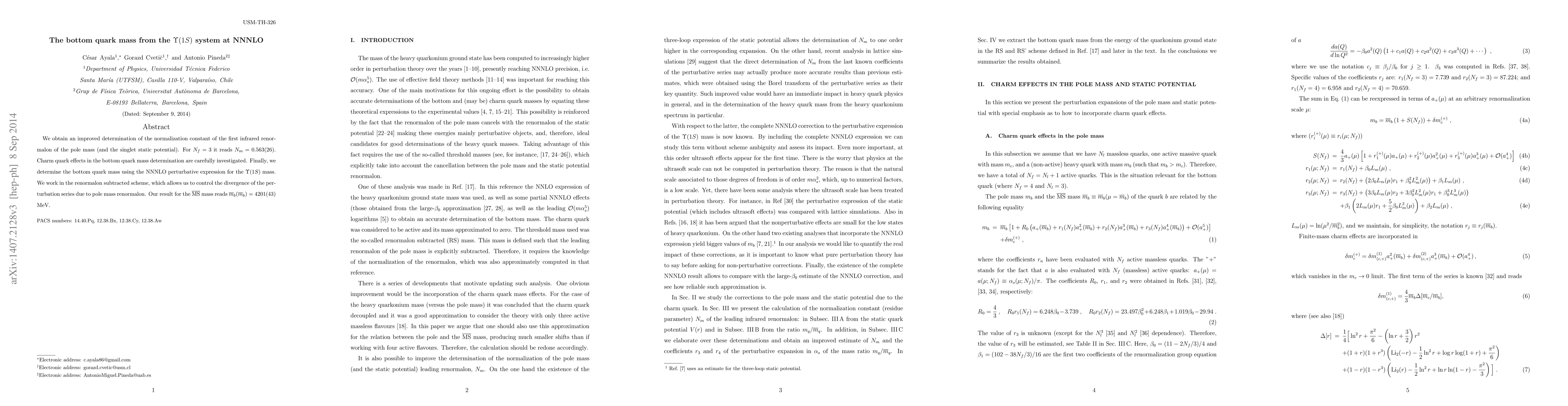 We obtain an improved determination of the normalization constant of the first infrared renormalon of the pole mass (and the singlet static potential). For $N_f=3$ it reads $N_m=0.563(26)$. Charm quark effects in the bottom quark mass determination are carefully investigated. Finally, we determine the bottom quark mass using the NNNLO perturbative expression for the $\Upsilon(1S)$ mass. We work in the renormalon subtracted scheme, which allows us to control the divergence of the perturbation series due to pole mass renormalon. Our result for the ${\overline {\rm MS}}$ mass reads ${\overline m}_{b}({\overline m}_{b})=4201(43)$ MeV.