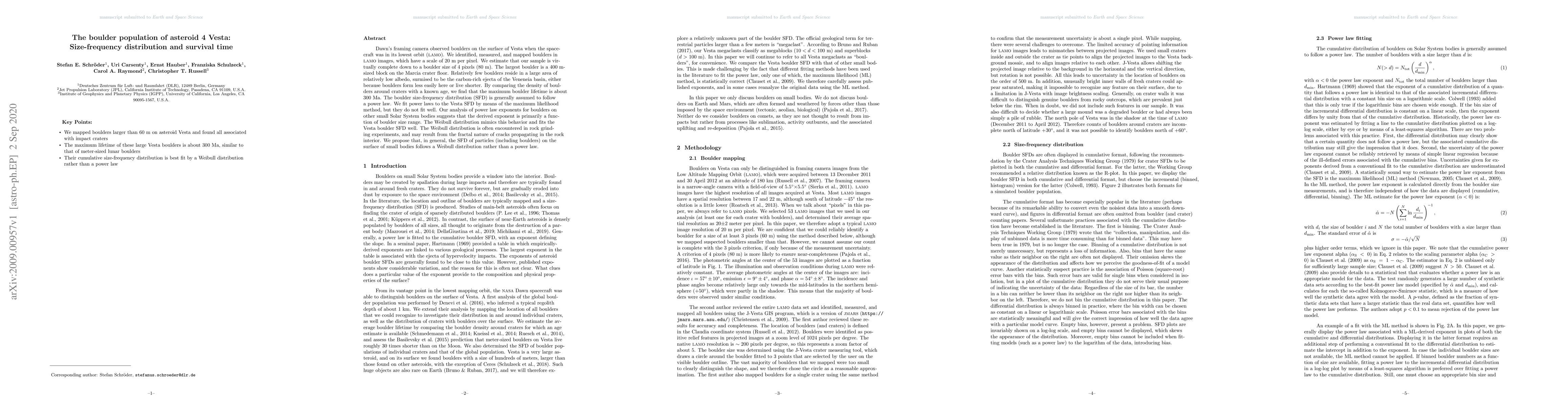 A NASA Dawn spacecraft study found that asteroid 4 Vesta's boulder population follows a Weibull distribution, challenging the traditional power law assumption, and estimated maximum boulder lifetime to be around 300 million years.