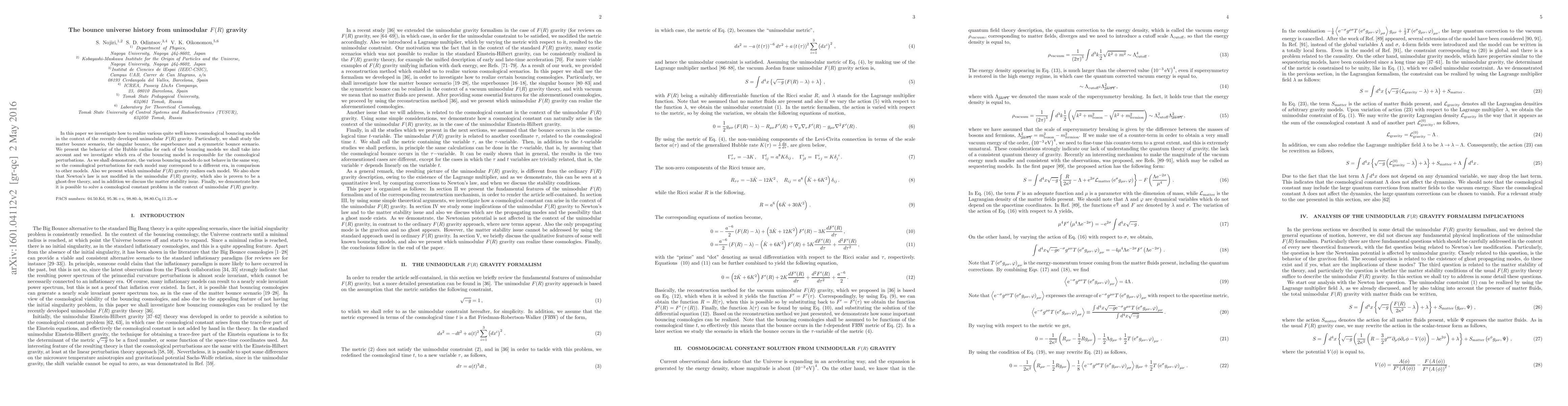This paper explores various cosmological bouncing models within unimodular $F(R)$ gravity, analyzing the behavior of the Hubble radius and the era responsible for cosmological perturbations in each model. It concludes that unimodular $F(R)$ gravity is ghost-free and does not modify Newton's law, while also addressing the cosmological constant problem.