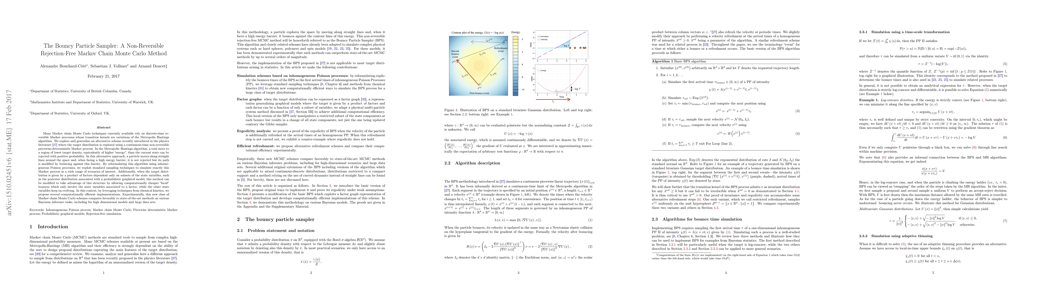 This paper introduces a novel non-reversible rejection-free Markov chain Monte Carlo (MCMC) method called the Bouncy Particle Sampler, which uses a continuous-time Markov process where particles bounce off high energy barriers instead of being rejected. The method is shown to efficiently sample complex probability distributions, including mixed discrete-continuous and restricted smooth domains, and outperforms Hybrid Monte Carlo in certain scenarios.