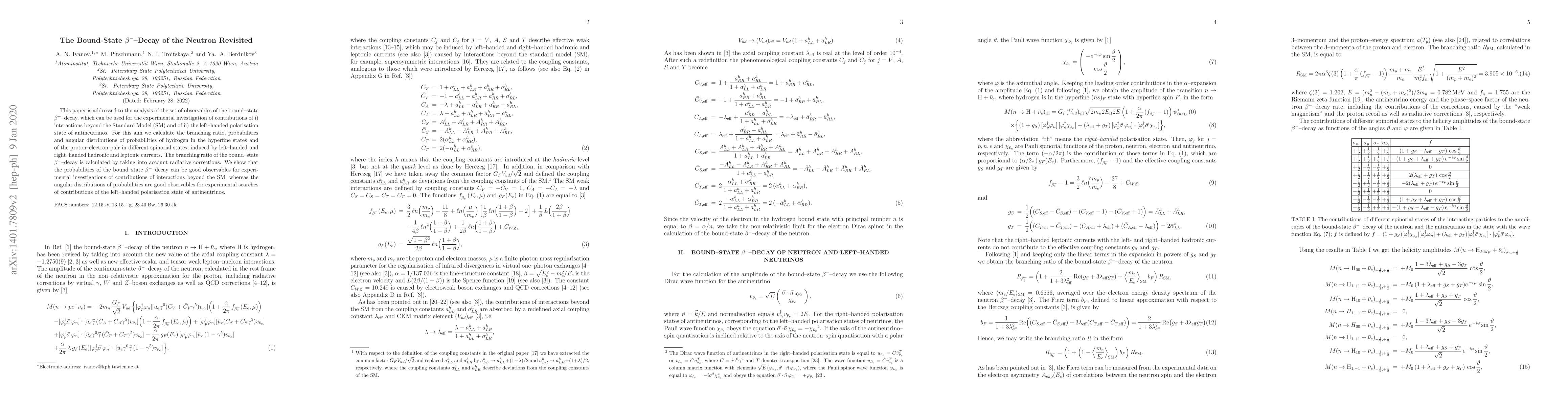 This paper is addressed to the analysis of the set of observables of the bound-state beta-decay, which can be used for the experimental investigation of contributions of i) interactions beyond the Standard Model (SM) and of ii) the left-handed polarisation state of antineutrinos. For this aim we calculate the branching ratio, probabilities and angular distributions of probabilities of hydrogen in the hyperfine states and of the proton-electron pair in different spinorial states, induced by left-handed and right-handed hadronic and leptonic currents. The branching ratio of the bound-state beta-decay is calculated by taking into account radiative corrections. We show that the probabilities of the bound-state beta-decay can be good observables for experimental investigations of contributions of interactions beyond the SM, whereas the angular distributions of probabilities are good observables for experimental searches of contributions of the left-handed polarisation state of antineutrinos.