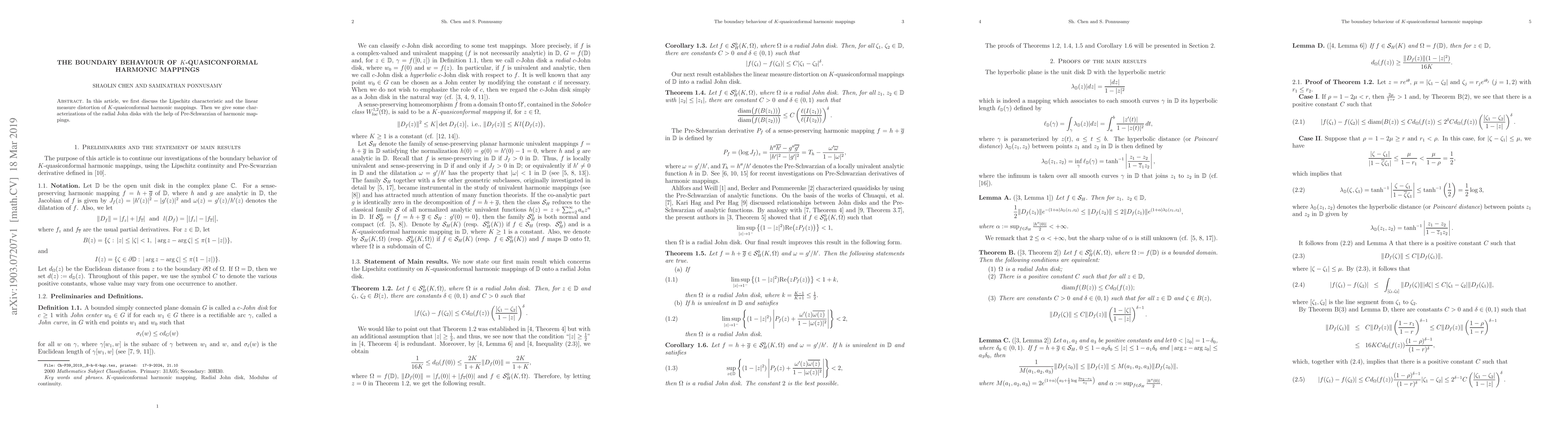 Summary: This paper explores the boundary behavior of $K$-quasiconformal harmonic mappings, examining their Lipschitz characteristics, measure distortion, and utilizing the Pre-Schwarzian to characterize radial John disks.