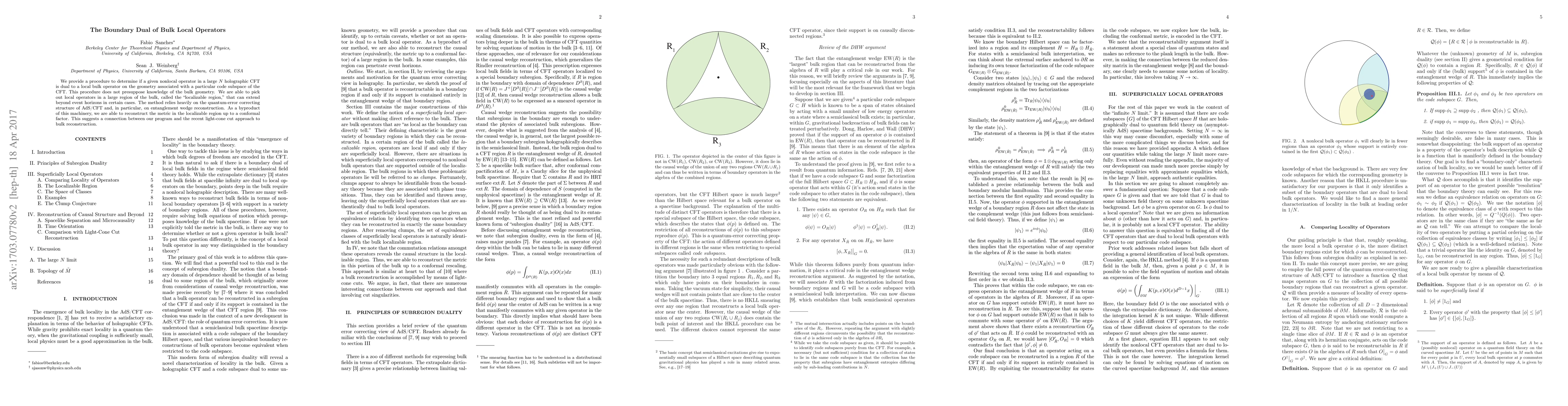 We provide a procedure to determine if a given nonlocal operator in a large N holographic CFT is dual to a local bulk operator on the geometry associated with a particular code subspace of the CFT. This procedure does not presuppose knowledge of the bulk geometry. We are able to pick out local operators in a large region of the bulk, called the "localizable region,"' that can extend beyond event horizons in certain cases. The method relies heavily on the quantum-error correcting structure of AdS/CFT and, in particular, on entanglement wedge reconstruction. As a byproduct of this machinery, we are able to reconstruct the metric in the localizable region up to a conformal factor. This suggests a connection between our program and the recent light-cone cut approach to bulk reconstruction.