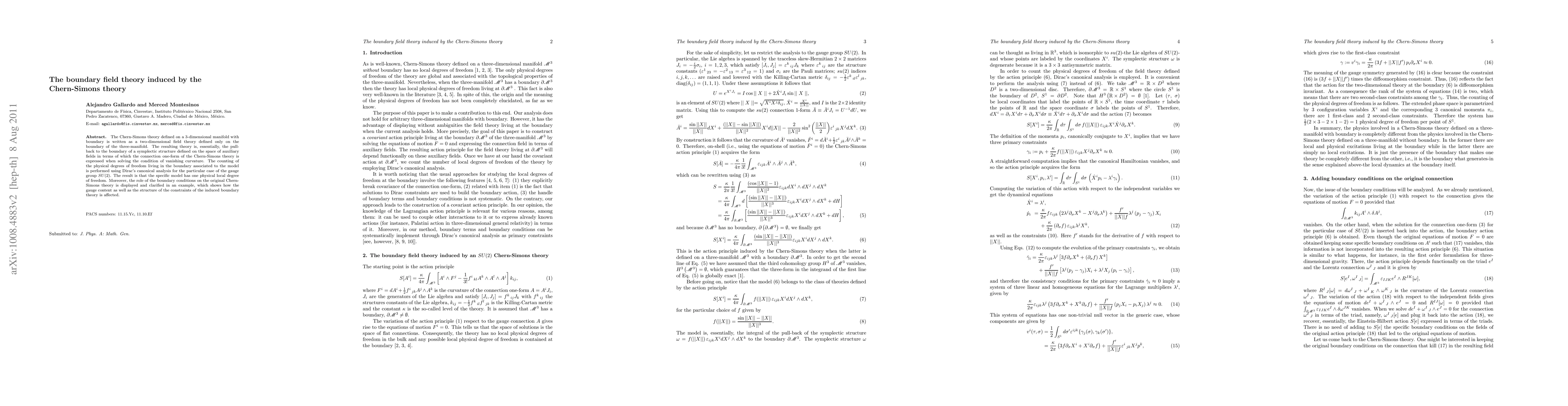 The Chern-Simons theory defined on a 3-dimensional manifold with boundary is written as a two-dimensional field theory defined only on the boundary of the three-manifold. The resulting theory is, essentially, the pullback to the boundary of a symplectic structure defined on the space of auxiliary fields in terms of which the connection one-form of the Chern-Simons theory is expressed when solving the condition of vanishing curvature. The counting of the physical degrees of freedom living in the boundary associated to the model is performed using Dirac's canonical analysis for the particular case of the gauge group SU(2). The result is that the specific model has one physical local degree of freedom. Moreover, the role of the boundary conditions on the original Chern- Simons theory is displayed and clarified in an example, which shows how the gauge content as well as the structure of the constraints of the induced boundary theory is affected.