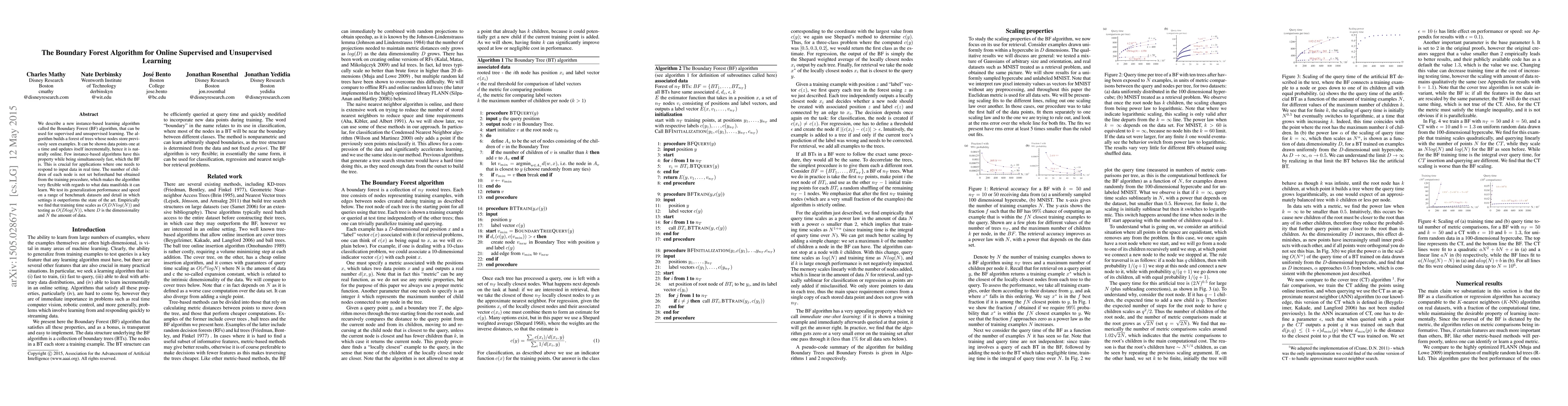 The Boundary Forest (BF) algorithm is introduced for online supervised and unsupervised learning, incrementally updating with new data points in real-time. It builds a flexible tree structure, adapting to various data manifolds, and outperforms existing methods in generalization performance and speed on benchmark datasets, with training time O(DNlog(N)) and testing time O(Dlog(N)).