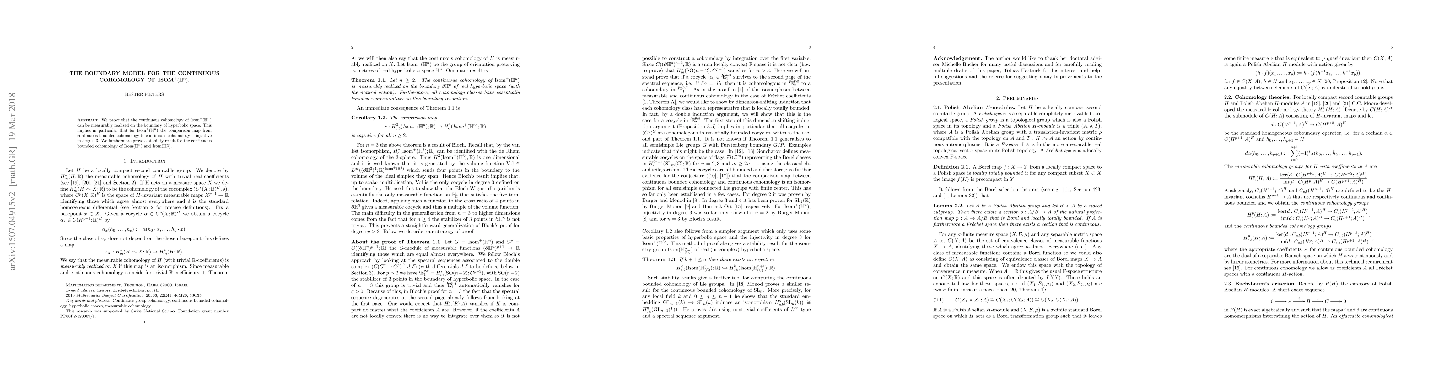 This paper proves that the continuous cohomology of $\text{Isom}^+(\mathbb{H}^n)$ can be realized on the boundary of hyperbolic space, showing the injectivity of the comparison map in degree $3$. It also establishes a stability result for the continuous bounded cohomology of $\text{Isom}(\mathbb{H}^n)$ and $\text{Isom}(\mathbb{H}_{\mathbb{C}}^n)$.