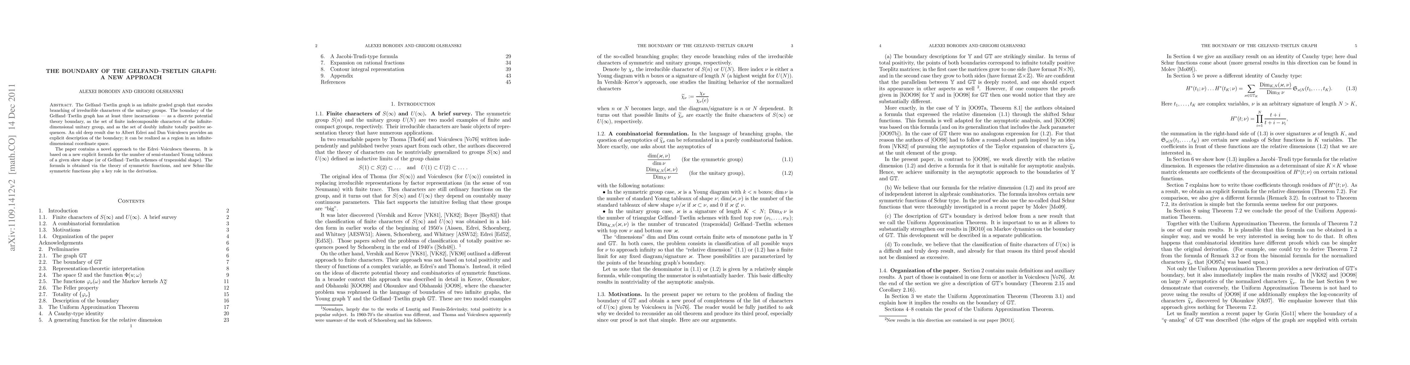 The Gelfand-Tsetlin graph is an infinite graded graph that encodes branching of irreducible characters of the unitary groups. The boundary of the Gelfand-Tsetlin graph has at least three incarnations --- as a discrete potential theory boundary, as the set of finite indecomposable characters of the infinite-dimensional unitary group, and as the set of doubly infinite totally positive sequences. An old deep result due to Albert Edrei and Dan Voiculescu provides an explicit description of the boundary; it can be realized as a region in an infinite-dimensional coordinate space. The paper contains a novel approach to the Edrei-Voiculescu theorem. It is based on a new explicit formula for the number of semi-standard Young tableaux of a given skew shape (or of Gelfand-Tsetlin schemes of trapezoidal shape). The formula is obtained via the theory of symmetric functions, and new Schur-like symmetric functions play a key role in the derivation.