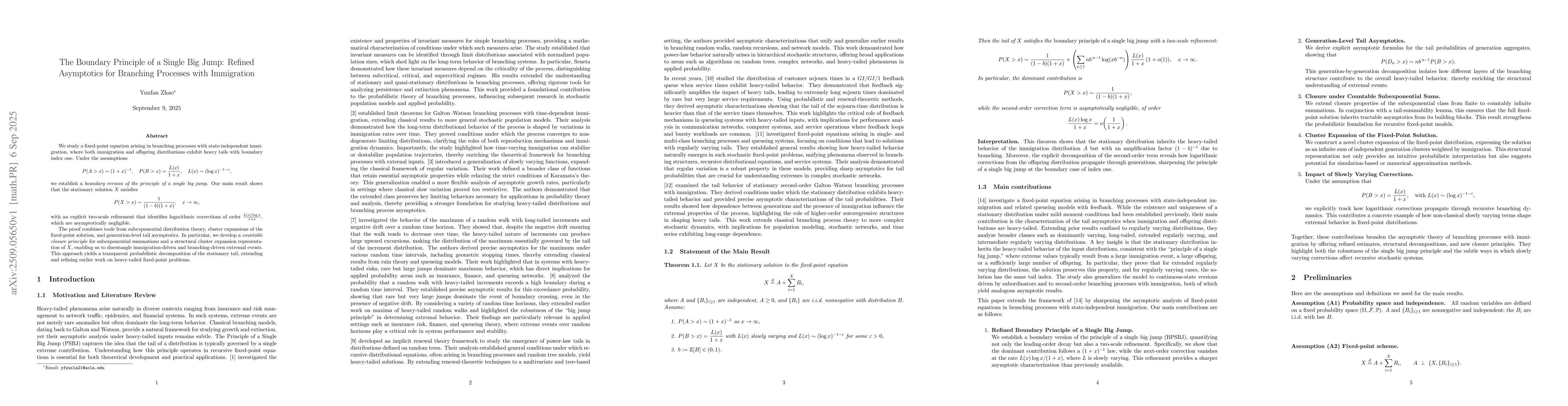We analyze the stationary tail of a fixed-point equation arising in branching processes with state-independent immigration, when both immigration and offspring distributions have heavy tails with boundary index one. We prove that \[ P(X > x) \sim \frac{1}{(1-b)(1+x)}, \quad x \to \infty, \] and provide a refined asymptotic identifying negligible logarithmic corrections. Our approach develops a closure principle for subexponential summations and a cluster expansion representation, which disentangles immigration- and branching-driven extremes.