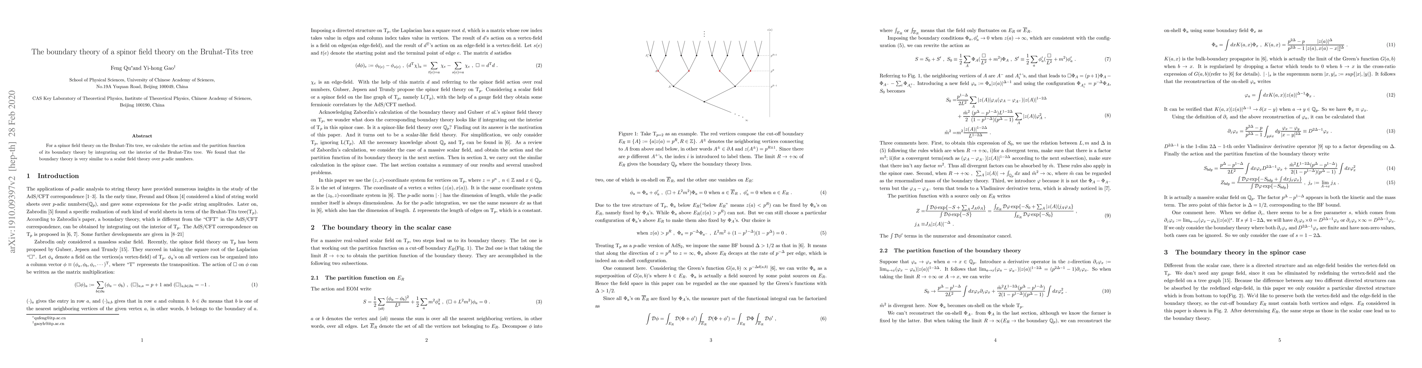 Summary: This paper calculates the action and partition function of a spinor field theory on the Bruhat-Tits tree by integrating out its interior, revealing that the resulting boundary theory closely resembles a scalar field theory over p-adic numbers.