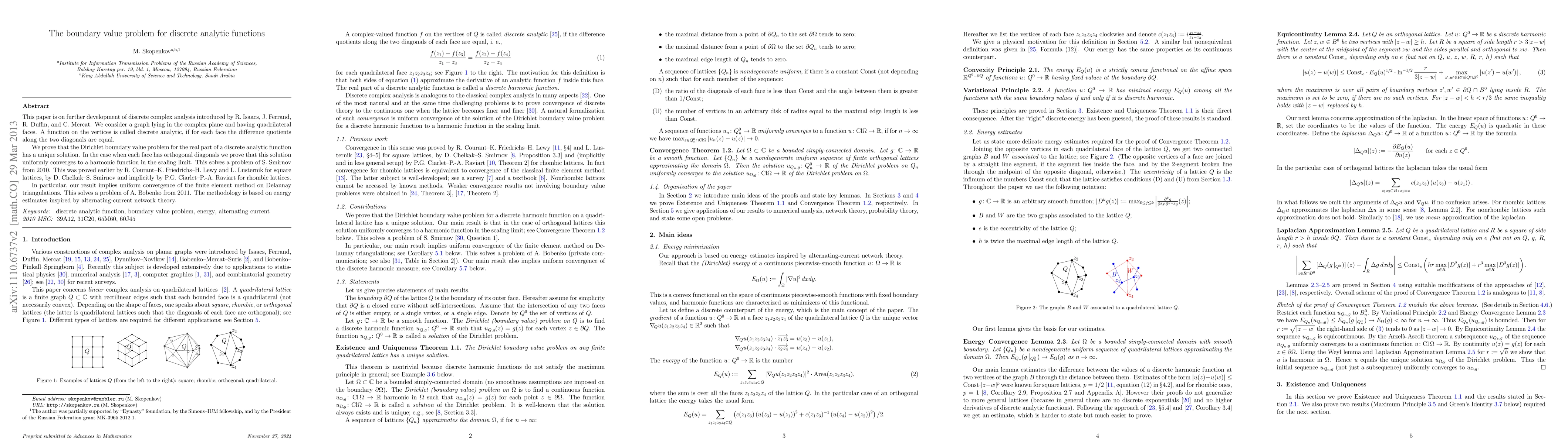 This paper is on further development of discrete complex analysis introduced by R. Isaacs, J. Ferrand, R. Duffin, and C. Mercat. We consider a graph lying in the complex plane and having quadrilateral faces. A function on the vertices is called discrete analytic, if for each face the difference quotients along the two diagonals are equal. We prove that the Dirichlet boundary value problem for the real part of a discrete analytic function has a unique solution. In the case when each face has orthogonal diagonals we prove that this solution uniformly converges to a harmonic function in the scaling limit. This solves a problem of S. Smirnov from 2010. This was proved earlier by R. Courant-K. Friedrichs-H. Lewy and L. Lusternik for square lattices, by D. Chelkak-S. Smirnov and implicitly by P.G. Ciarlet-P.-A. Raviart for rhombic lattices. In particular, our result implies uniform convergence of the finite element method on Delaunay triangulations. This solves a problem of A. Bobenko from 2011. The methodology is based on energy estimates inspired by alternating-current network theory.