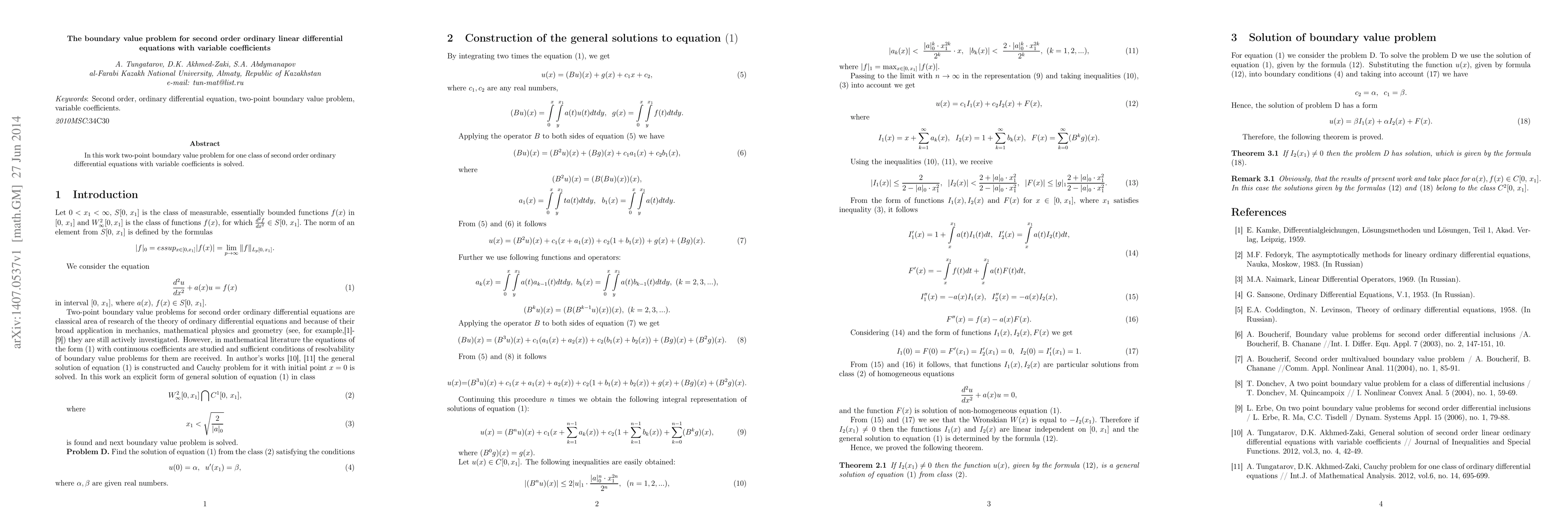 Summary: This paper addresses the solution of a two-point boundary value problem for second order ordinary linear differential equations with variable coefficients, providing a comprehensive method to find the solutions.