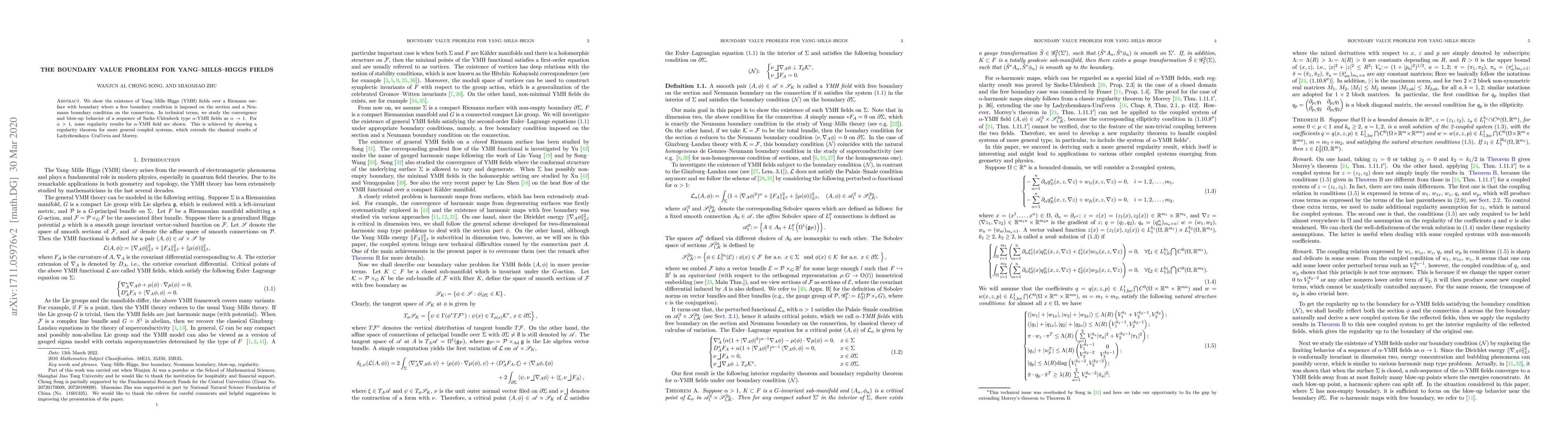We show the existence of Yang--Mills--Higgs (YMH) fields over a Riemann surface with boundary where a free boundary condition is imposed on the section and a Neumann boundary condition on the connection. In technical terms, we study the convergence and blow-up behavior of a sequence of Sacks-Uhlenbeck type $\alpha$-YMH fields as $\alpha\to 1$. For $\alpha>1$, each $\alpha$-YMH field is shown to be smooth up to the boundary under some gauge transformation. This is achieved by showing a regularity theorem for more general coupled systems, which extends the classical results of Ladyzhenskaya-Ural'ceva and Morrey.