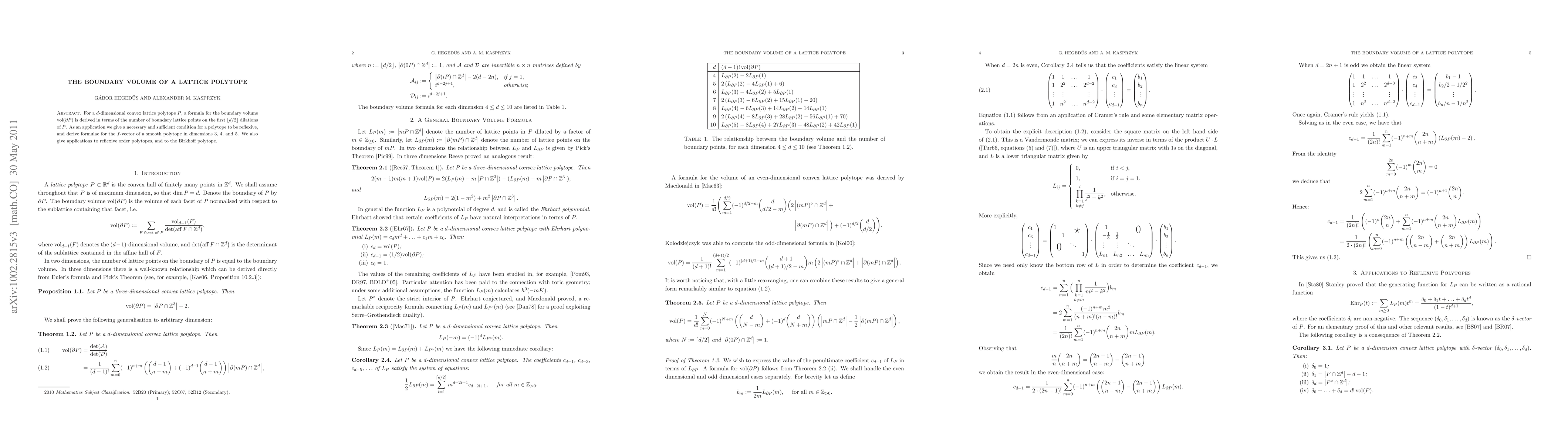 For a d-dimensional convex lattice polytope P, a formula for the boundary volume is derived in terms of the number of boundary lattice points on the first $\floor{d/2}$ dilations of P. As an application we give a necessary and sufficient condition for a polytope to be reflexive, and derive formulae for the f-vector of a smooth polytope in dimensions 3, 4, and 5. We also give applications to reflexive order polytopes, and to the Birkhoff polytope.
