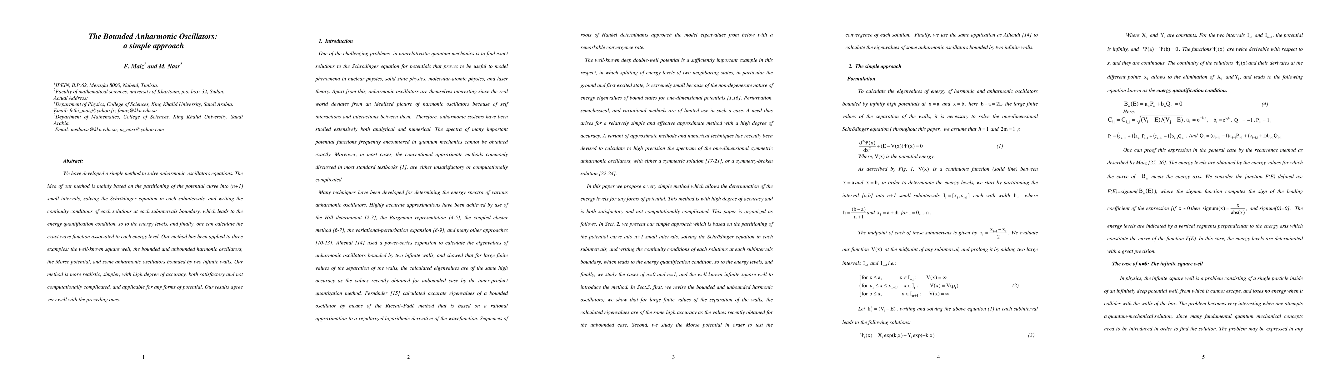 We have developed a simple method to solve anharmonic oscillators equations. The idea of our method is mainly based on the partitioning of the potential curve into (n+1) small intervals, solving the Schr\"odinger equation in each subintervals, and writing the continuity conditions of each solutions at each subintervals boundary, which leads to the energy quantification condition, so to the energy levels, and finally, one can calculate the exact wave function associated to each energy level. Our method has been applied to three examples: the well-known square well, the bounded and unbounded harmonic oscillators, the Morse potential, and some anharmonic oscillators bounded by two infinite walls. Our method is more realistic, simpler, with high degree of accuracy, both satisfactory and not computationally complicated, and applicable for any forms of potential. Our results agree very well with the preceding ones.