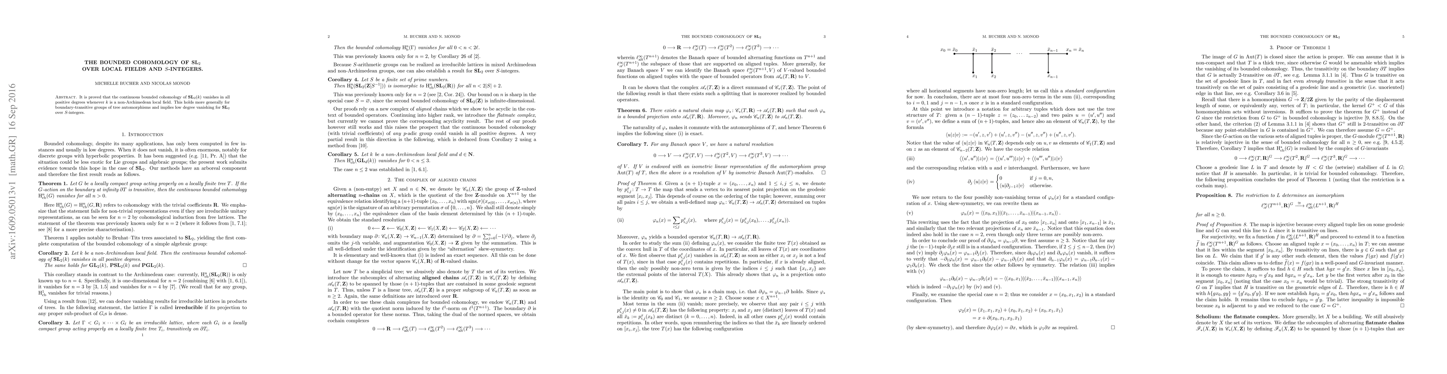 The continuous bounded cohomology of SL_2(k) vanishes in positive degrees for non-Archimedean local fields, extending to S-integers with similar results.