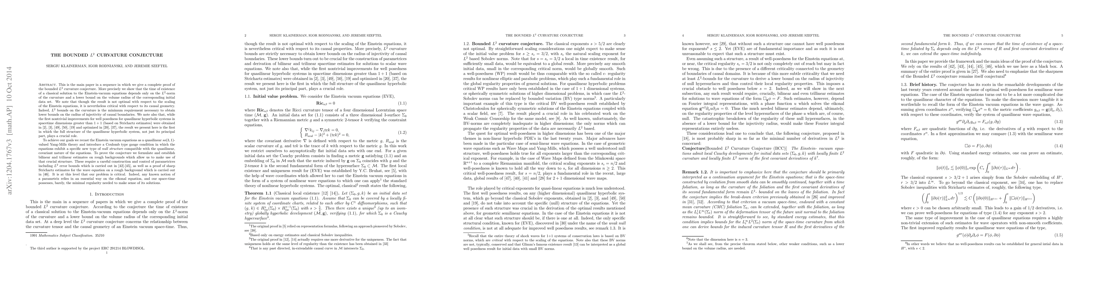 This paper provides a comprehensive proof for the bounded L2 curvature conjecture in the context of Einstein-vacuum equations. It demonstrates that a solution's existence time depends on the L2-norm of curvature and a lower bound on the volume radius of initial data sets. The authors achieved this by reformulating the Einstein vacuum equations as a quasilinear Yang-Mills theory, employing a Coulomb gauge, and establishing new bilinear and trilinear estimates on rough backgrounds, supported by sharp Strichartz estimates for the wave equation on such backgrounds.