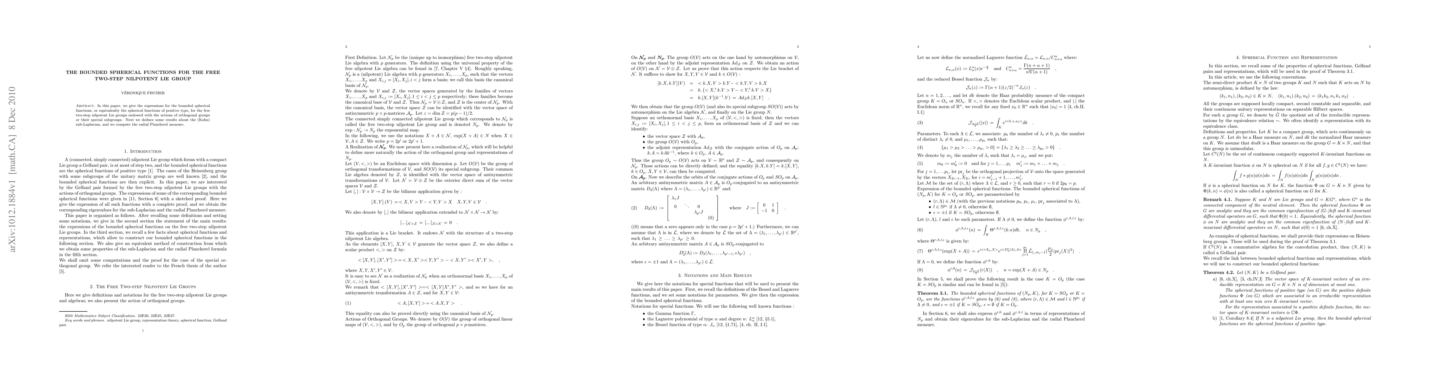 This paper provides expressions for bounded spherical functions for free two-step nilpotent Lie groups under orthogonal group actions, and computes the radial Plancherel measure, while also deriving results about the Kohn sub-Laplacian.