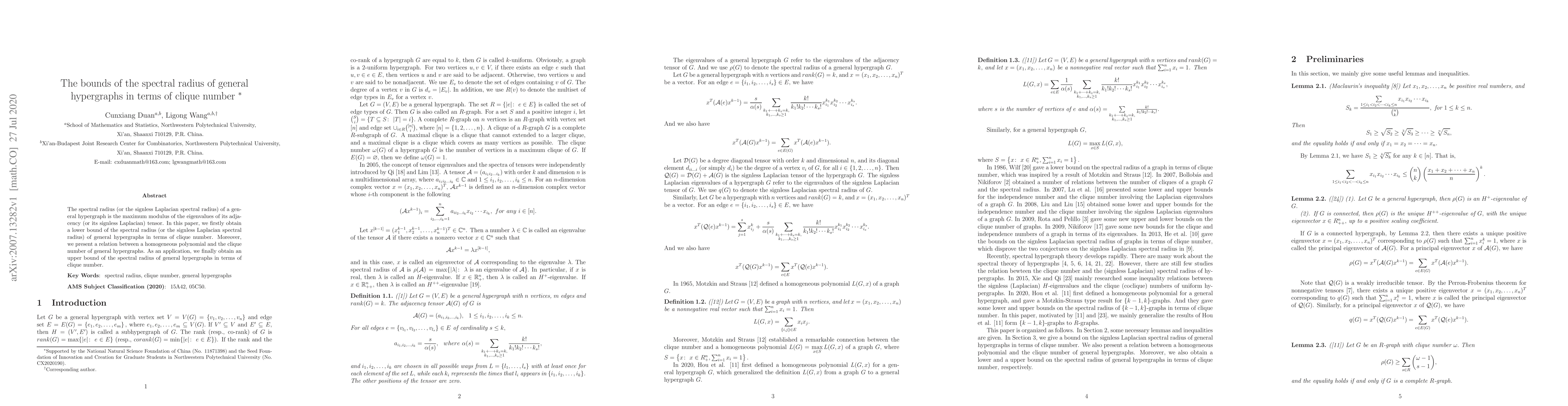 The spectral radius (or the signless Laplacian spectral radius) of a general hypergraph is the maximum modulus of the eigenvalues of its adjacency (or its signless Laplacian) tensor. In this paper, we firstly obtain a lower bound of the spectral radius (or the signless Laplacian spectral radius) of general hypergraphs in terms of clique number. Moreover, we present a relation between a homogeneous polynomial and the clique number of general hypergraphs. As an application, we finally obtain an upper bound of the spectral radius of general hypergraphs in terms of clique number.
