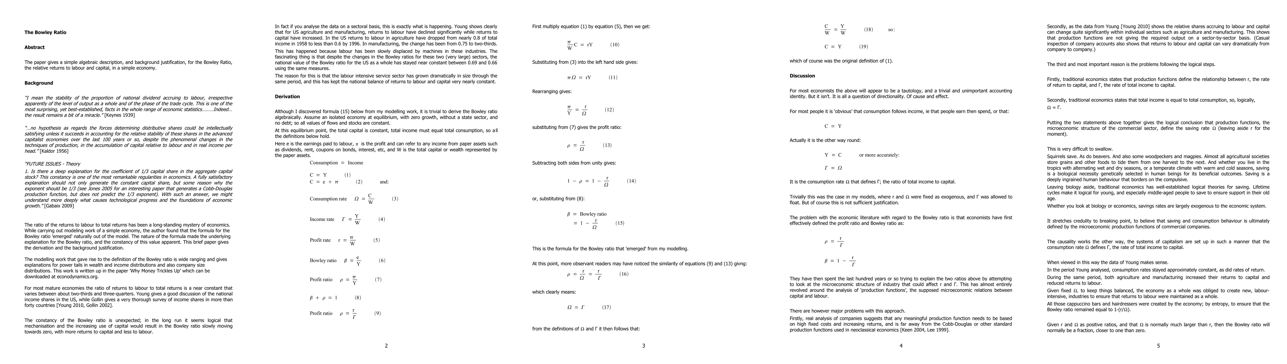 The paper gives a simple algebraic description, and background justification, for the Bowley Ratio, the relative returns to labour and capital, in a simple economy.