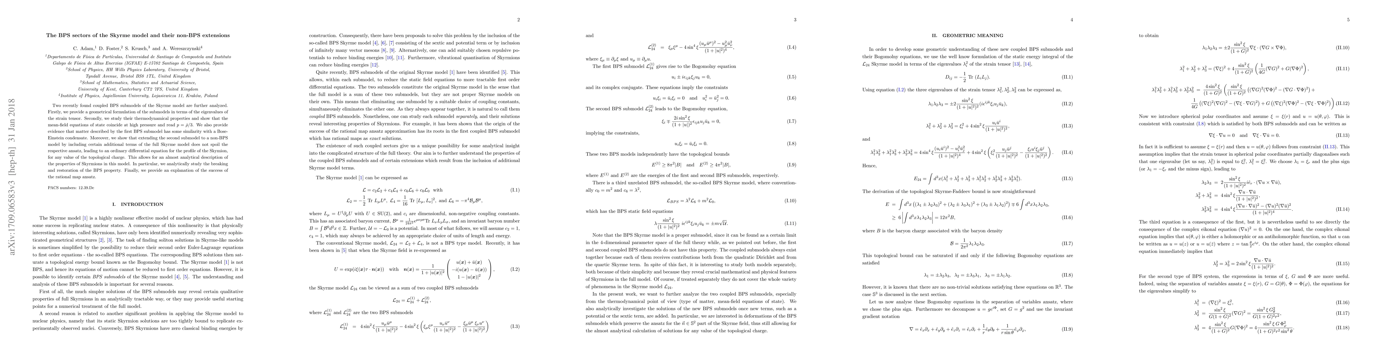 Two recently found coupled BPS submodels of the Skyrme model are further analyzed. Firstly, we provide a geometrical formulation of the submodels in terms of the eigenvalues of the strain tensor. Secondly, we study their thermodynamical properties and show that the mean-field equations of state coincide at high pressure and read $p=\bar{\rho}/3$. We also provide evidence that matter described by the first BPS submodel has some similarity with a Bose-Einstein condensate. Moreover, we show that extending the second submodel to a non-BPS model by including certain additional terms of the full Skyrme model does not spoil the respective ansatz, leading to an ordinary differential equation for the profile of the Skymion, for any value of the topological charge. This allows for an almost analytical description of the properties of Skyrmions in this model. In particular, we analytically study the breaking and restoration of the BPS property. Finally, we provide an explanation of the success of the rational map ansatz.