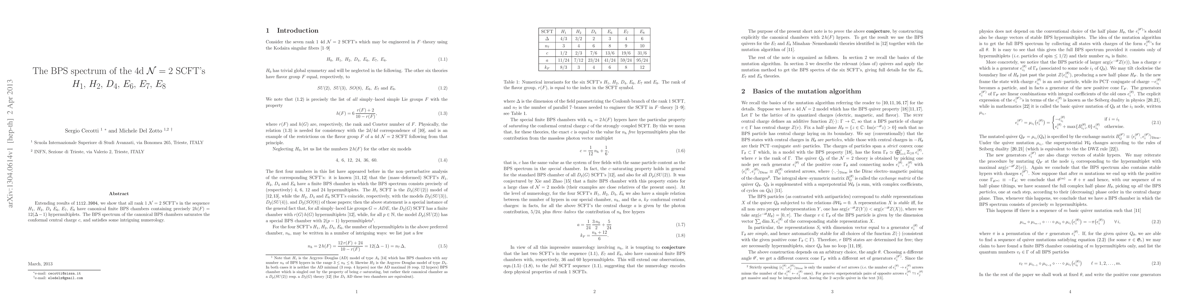 Extending results of arXiv:1112.3984, we show that all rank 1 N=2 SCFT's in the sequence H_1, H_2, D_4 E_6, E_7, E_8 have canonical finite BPS chambers containing precisely 2 h(F)=12(Delta-1) hypermultiplets. The BPS spectrum of the canonical BPS chambers saturates the conformal central charge c, and satisfies some intriguing numerology.