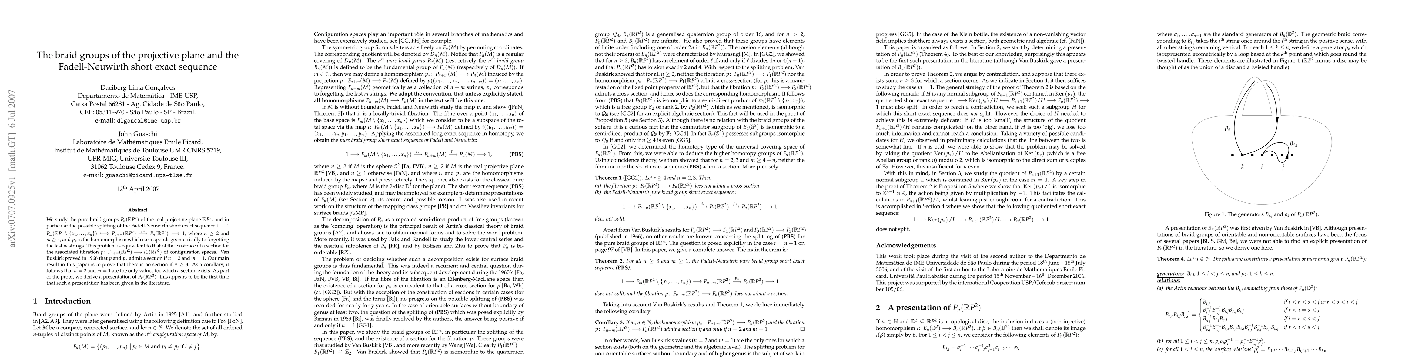 Researchers studied the braid groups of the real projective plane and found that there is no section for a specific short exact sequence when n is 3 or greater, with only n=2 and m=1 providing a solution.