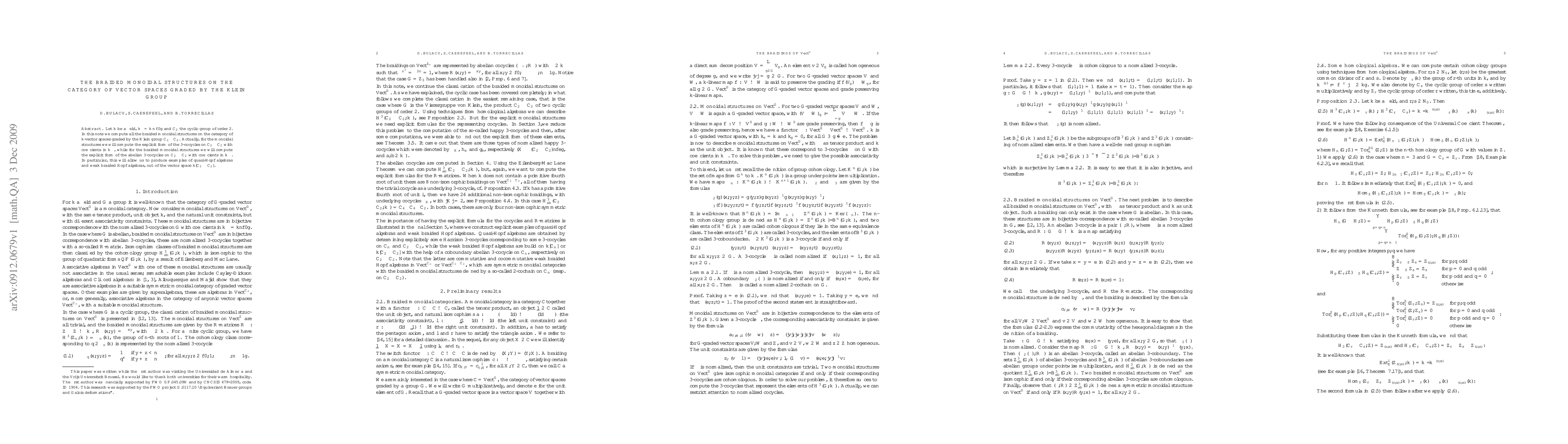 This paper computes all braided monoidal structures on the category of $k$-vector spaces graded by the Klein group $C_2\times C_2$. It explicitly determines the 3-cocycles on $C_2\times C_2$ for monoidal and abelian 3-cocycles for braided monoidal structures, providing examples of quasi-Hopf and weak braided Hopf algebras.