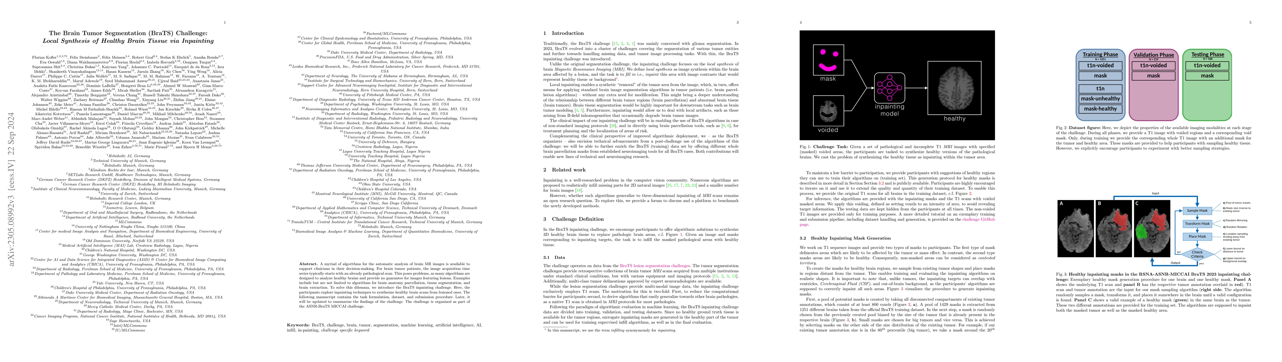 The BraTS 2023 inpainting challenge aims to develop algorithms that can synthesize healthy brain tissue from MRI scans featuring brain tumors. The challenge seeks innovative inpainting techniques to address the limitations of existing algorithms that are not designed for pathological images.