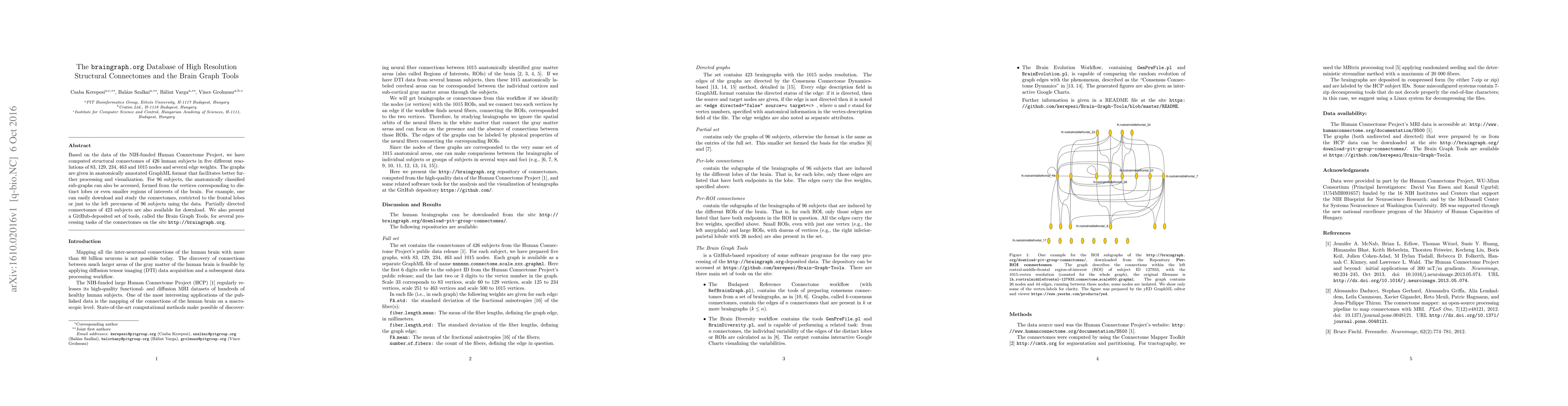 The braingraph.org database provides high-resolution structural connectomes from the NIH-funded Human Connectome Project, offering 426 subjects' connectomes in various resolutions. The Brain Graph Tools facilitate further processing and visualization of these connectomes.