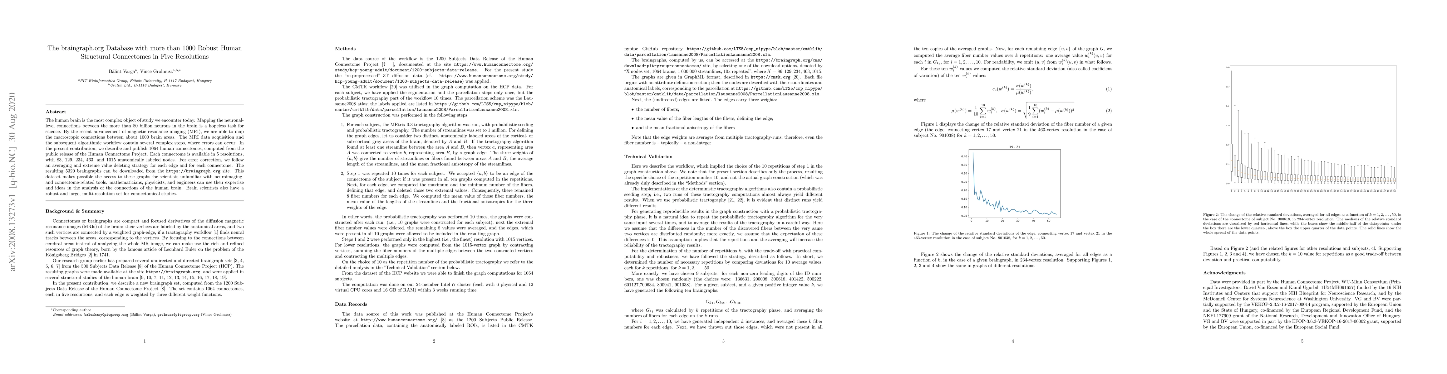 The braingraph.org database presents 1064 human structural connectomes derived from the Human Connectome Project, available in five resolutions with varying node counts. This dataset facilitates analysis across multiple scientific disciplines, offering robust multi-resolution brain graphs for both neuroscientists and non-neuroimaging experts.