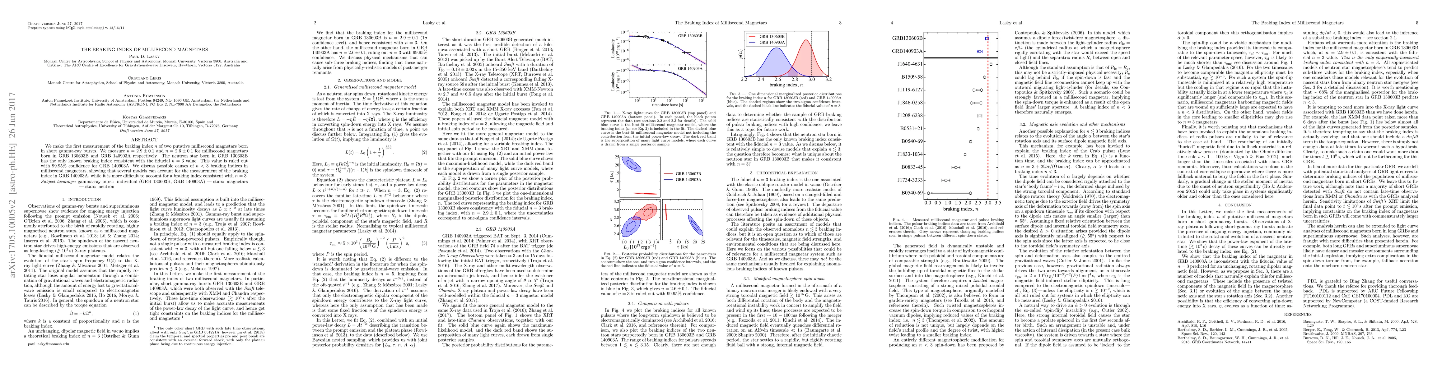 This study measures the braking index $n$ for two millisecond magnetars, finding $n=2.9\pm0.1$ and $n=2.6\pm0.1$ respectively, with the first consistent with $n=3$ but the second ruled out at 99.95% confidence. The paper explores models explaining the observed deviations from $n=3$.