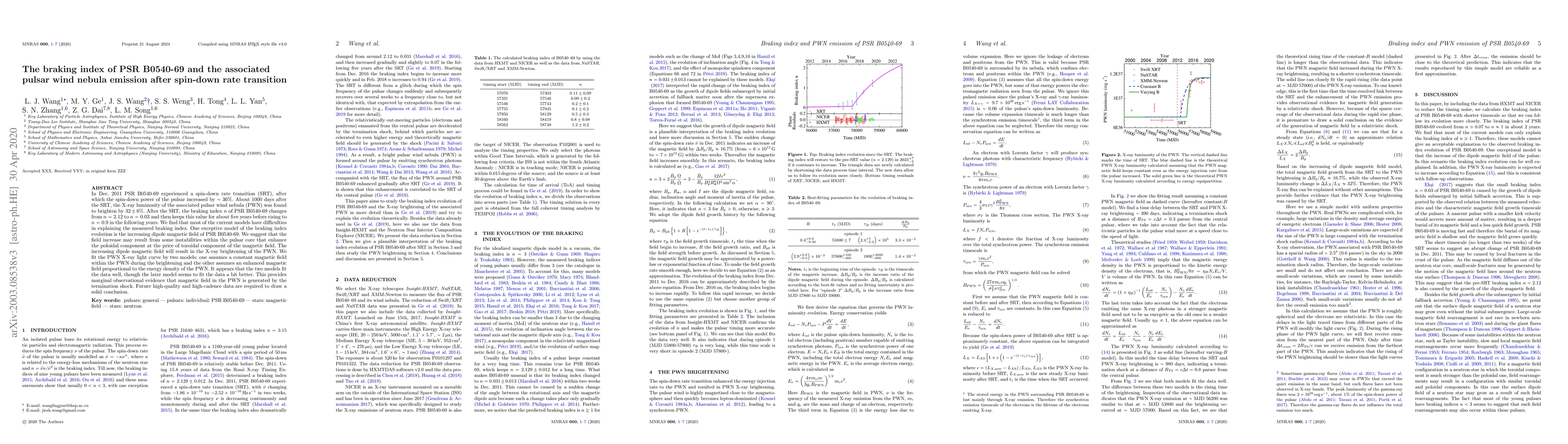 In Dec. 2011 PSR B0540-69 experienced a spin-down rate transition (SRT), after which the spin-down power of the pulsar increased by ~36%. About 1000 days after the SRT, the X-ray luminosity of the associated pulsar wind nebula (PWN) was found to brighten by 32+/-8%. After the SRT, the braking index n of PSR B0540-69 changes from n=2.12 to n=0.03 and then keeps this value for about five years before rising to n=0.9 in the following years. We find that most of the current models have difficulties in explaining the measured braking index. One exceptive model of the braking index evolution is the increasing dipole magnetic field of PSR B0540-69. We suggest that the field increase may result from some instabilities within the pulsar core that enhance the poloidal component at the price of toroidal component of the magnetic field. The increasing dipole magnetic field will result in the X-ray brightening of the PWN. We fit the PWN X-ray light curve by two models: one assumes a constant magnetic field within the PWN during the brightening and the other assumes an enhanced magnetic field proportional to the energy density of the PWN. It appears that the two models fit the data well, though the later model seems to fit the data a bit better. This provides marginal observational evidence that magnetic field in the PWN is generated by the termination shock. Future high-quality and high-cadence data are required to draw a solid conclusion.
