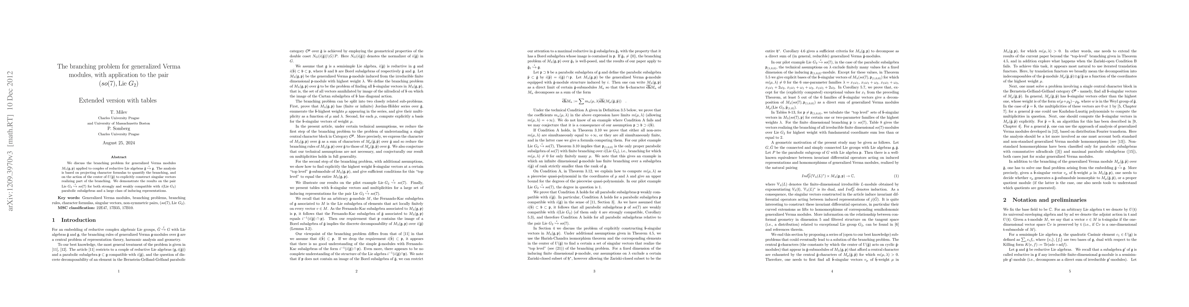 Summary: This paper examines the branching problem for generalized Verma modules $M_\lambda(\mathfrak g, \mathfrak p)$ between reductive Lie algebras $\bar{\mathfrak g}\hookrightarrow \mathfrak g$, focusing on the pair $(\mathrm{Lie}G_2, \mathrm{so}(7))$. It uses character projections and center actions to construct singular vectors and analyzes both strongly and weakly compatible parabolic subalgebras.