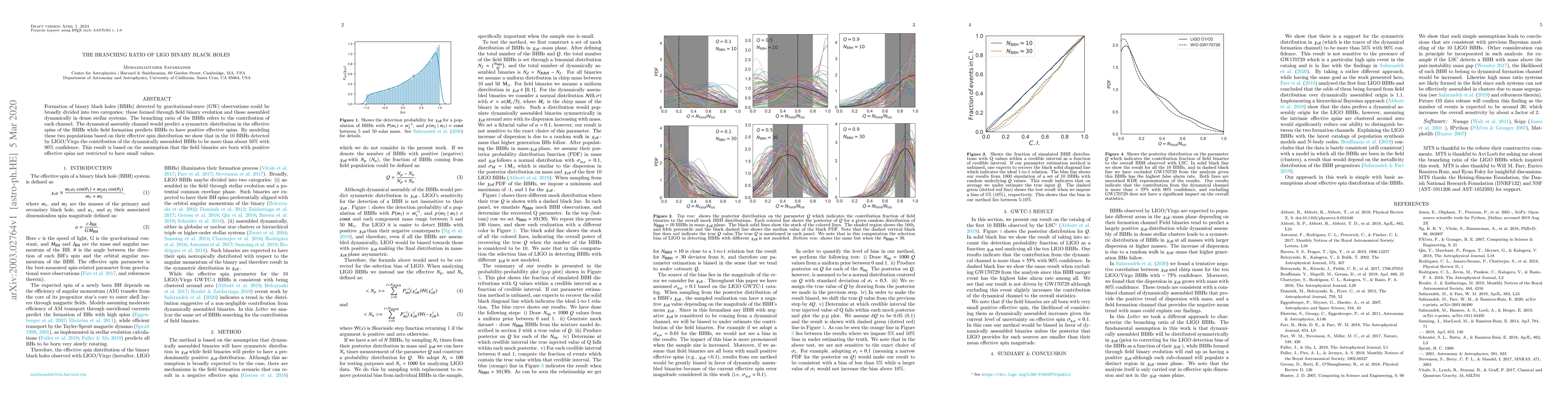 Formation of binary black holes (BBHs) detected by gravitational-wave (GW) observations could be broadly divided into two categories: those formed through field binary evolution and those assembled dynamically in dense stellar systems. The branching ratio of the BBHs refers to the contribution of each channel. The dynamical assembly channel would predict a symmetric distribution in the effective spins of the BBHs while field formation predicts BBHs to have positive effective spins. By modeling these two populations based on their effective spin distribution we show that in the 10 BBHs detected by LIGO/Virgo the contribution of the dynamically assembled BBHs to be more than about 50\% with 90\% confidence. This result is based on the assumption that the field binaries are born with positive effective spins not restricted to have small values.